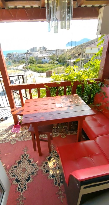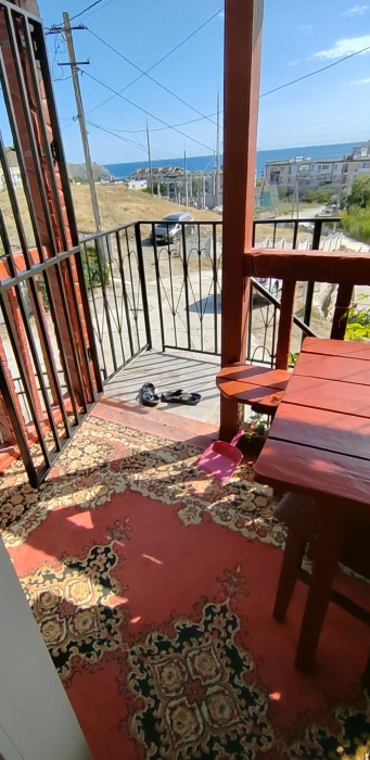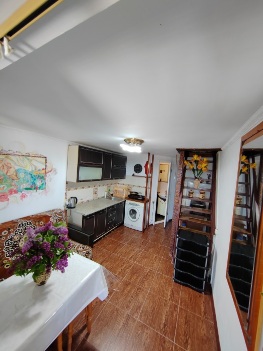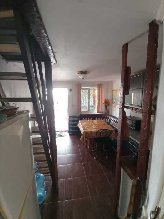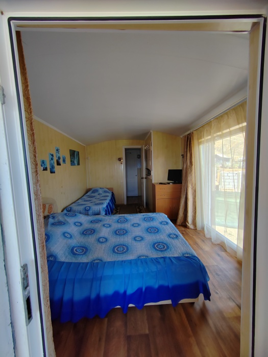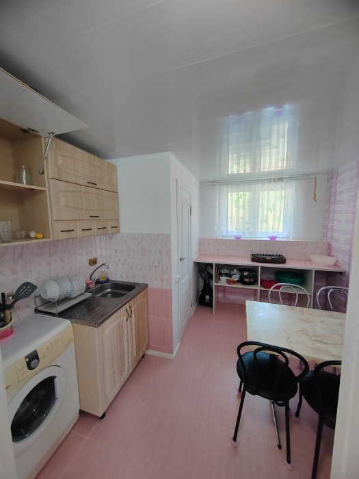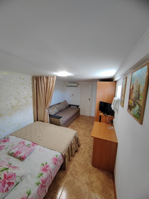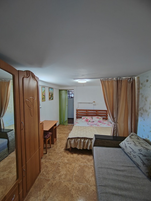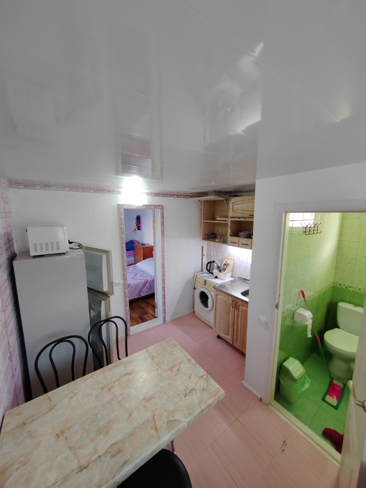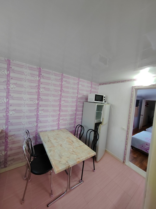Сдаётся дом на три комнаты. на первом этаже сначала идет балкон,коричневая кухня, коричневый санузел и зелёная комната на 4 чел с кондиционером и телевизором.