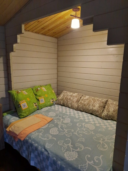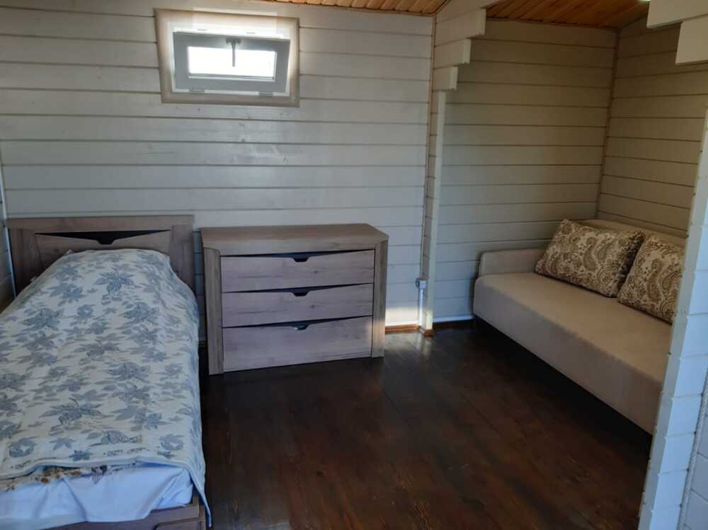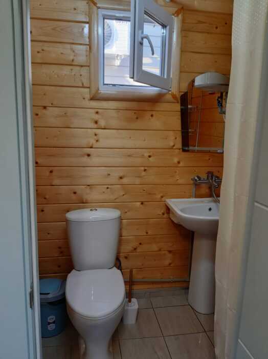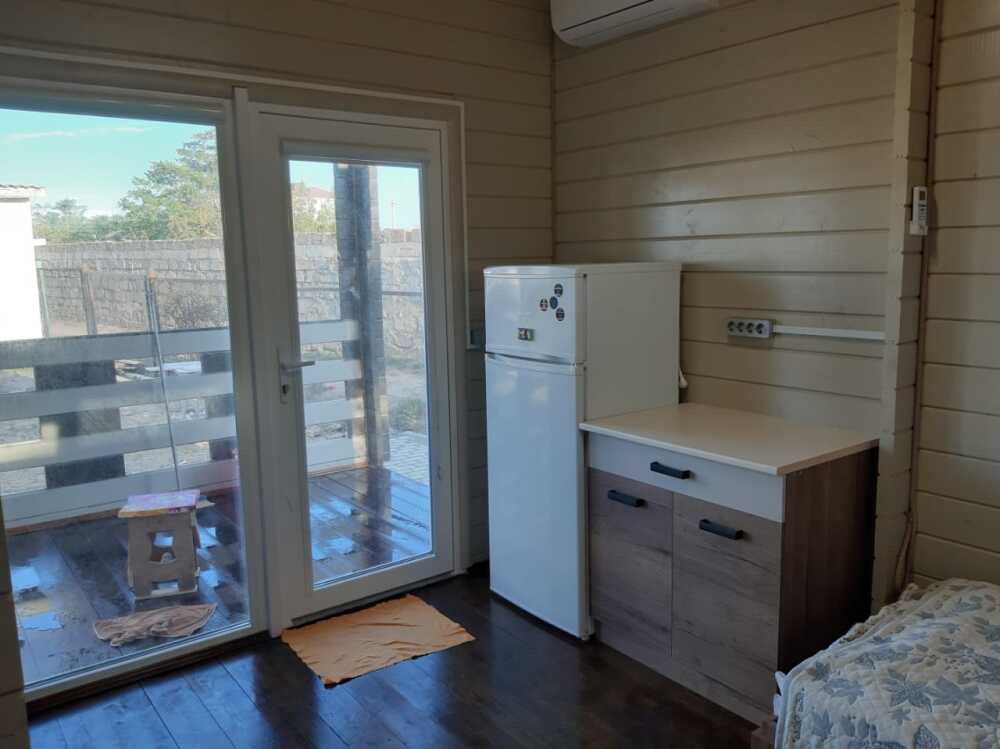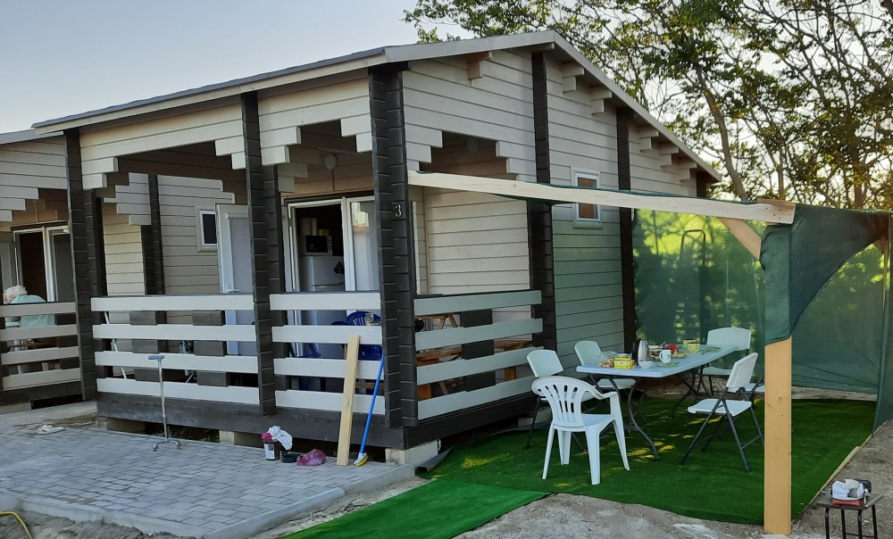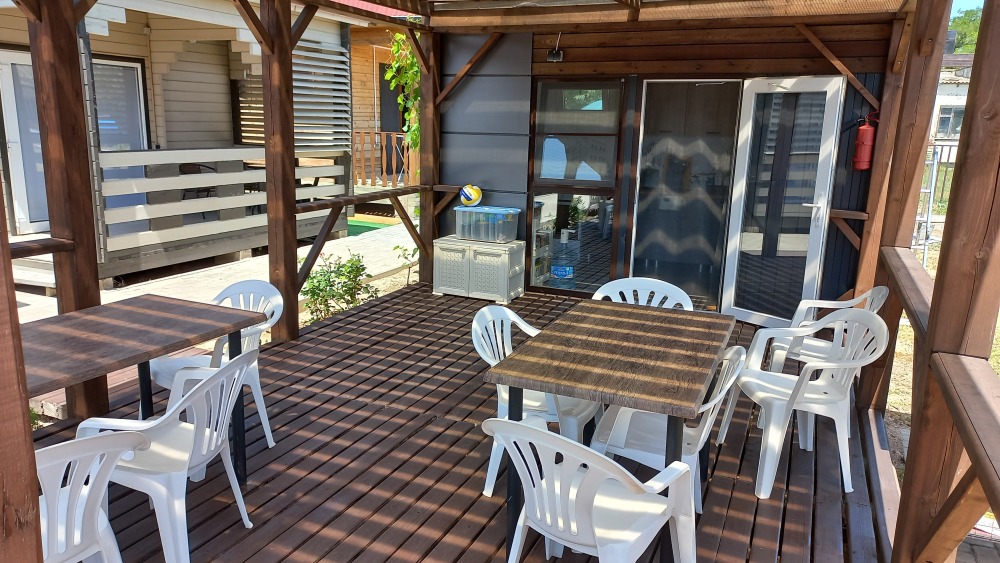 Новые комфортабельные домики 2020 года постройки из натурального дерева. Три спальных места (диван и кровать), туалет, душ, кондиционер, холодильник, просторная терраса, телевизор, на территории базы есть Wi-Fi. Есть летний душ и поддон для ополаскивания ног после моря. Садовые качели, игрушки для маленьких отдыхающих, а для подростков и взрослых современные настольные игры.