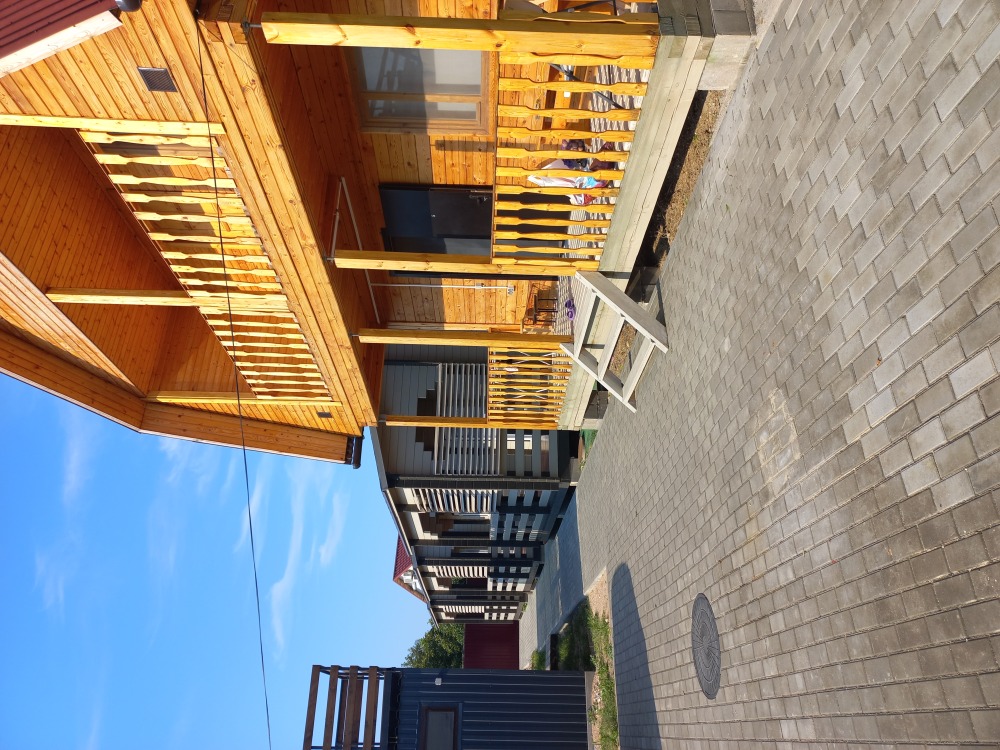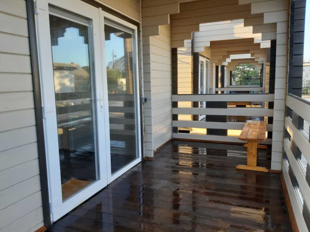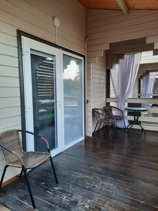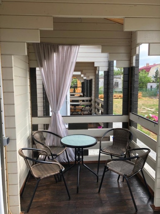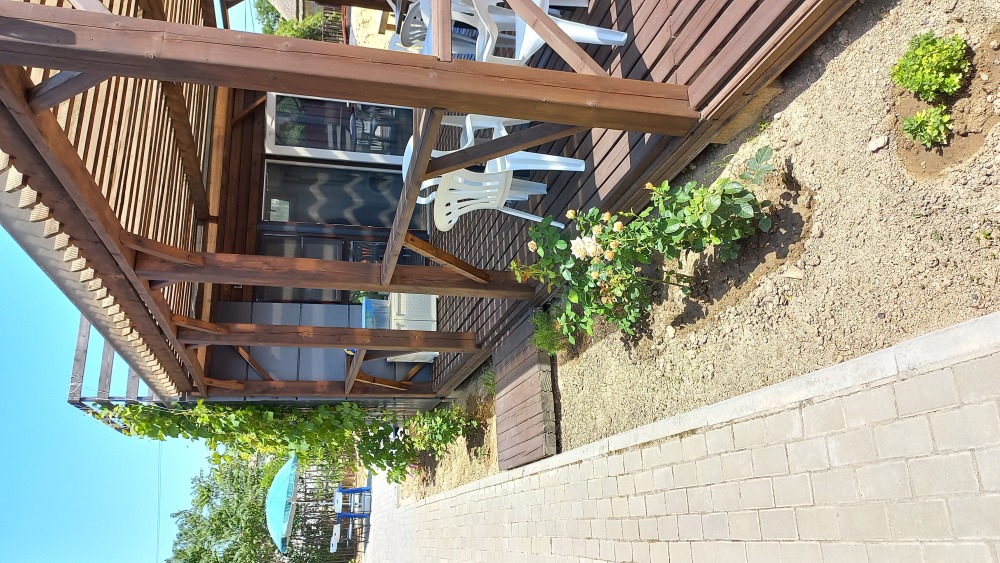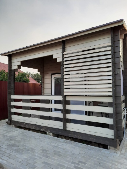 Новые комфортабельные домики 2020 года постройки из натурального дерева. Три спальных места (диван и кровать), туалет, душ, кондиционер, холодильник, просторная терраса, телевизор, на территории базы есть Wi-Fi. Есть летний душ и поддон для ополаскивания ног после моря. Садовые качели, игрушки для маленьких отдыхающих, а для подростков и взрослых современные настольные игры.