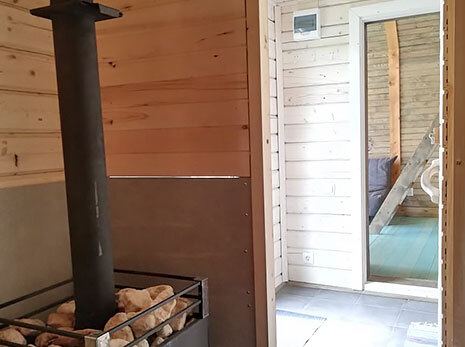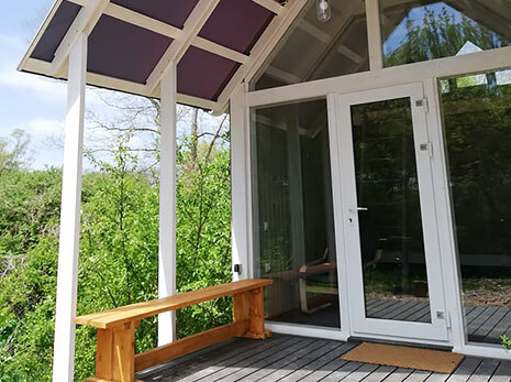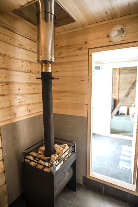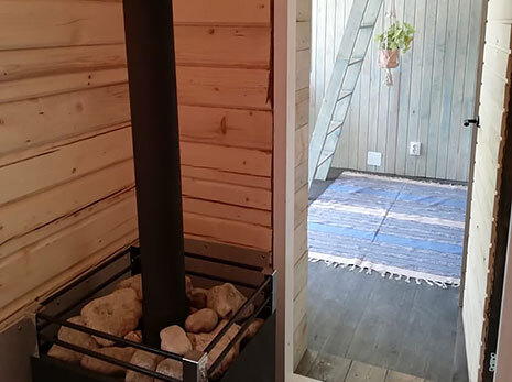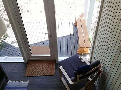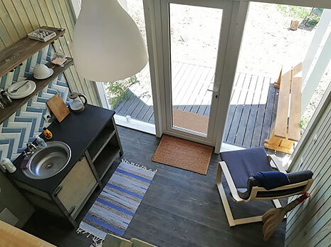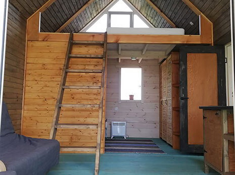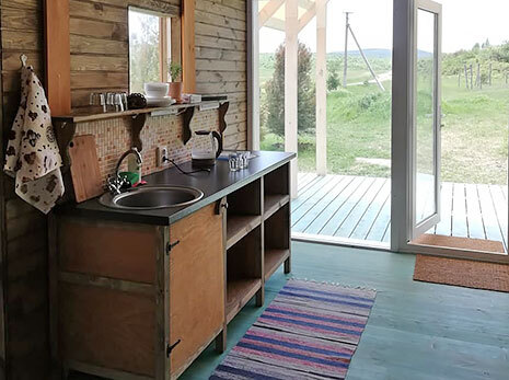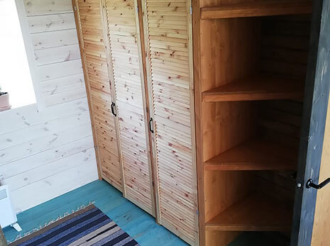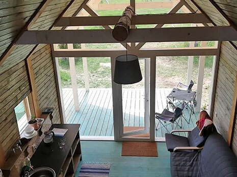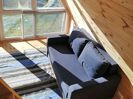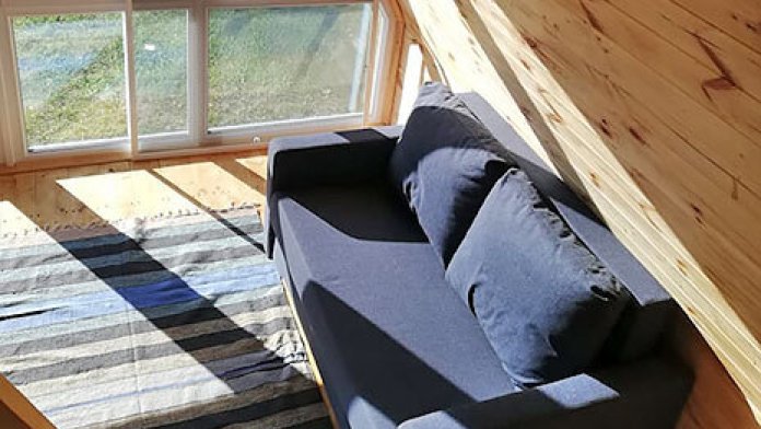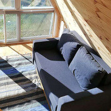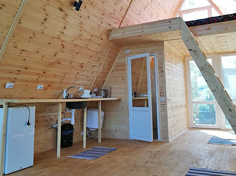 К коттеджу примыкает деревянный помост с зоной отдыха. Интерьер внутри гармонично соединяет в себе спальню, гостиную и кухню. Небольшой уютный домик оборудован таким образом, чтобы вы могли полноценно отдохнуть, набраться сил и, при желании, удаленно поработать.
