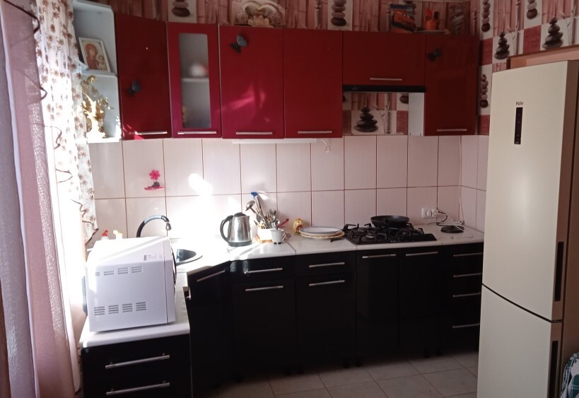 Рядом кухня. Газ. Плита, холодильник, посуда, мойка, стол, шкафы, электрочайник, стиральн машина.