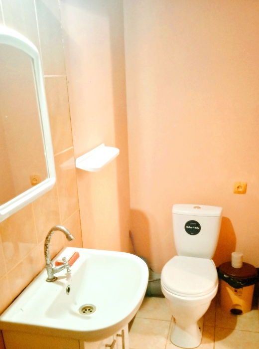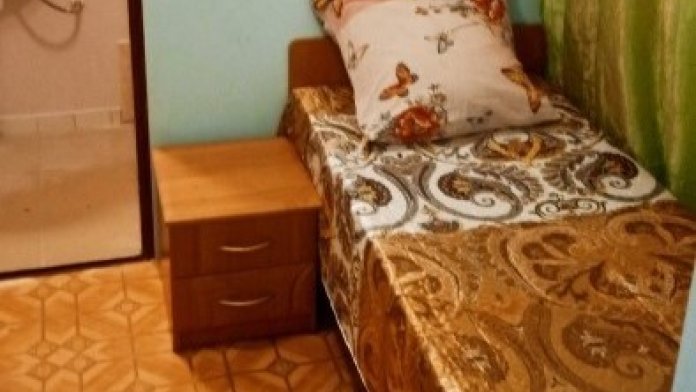 Небольшая прихожая, шкаф для вещей, комната и санузел совмещен. Кухня во дворе на две семьи: чайник, плита, холодильник, стиральная машина.