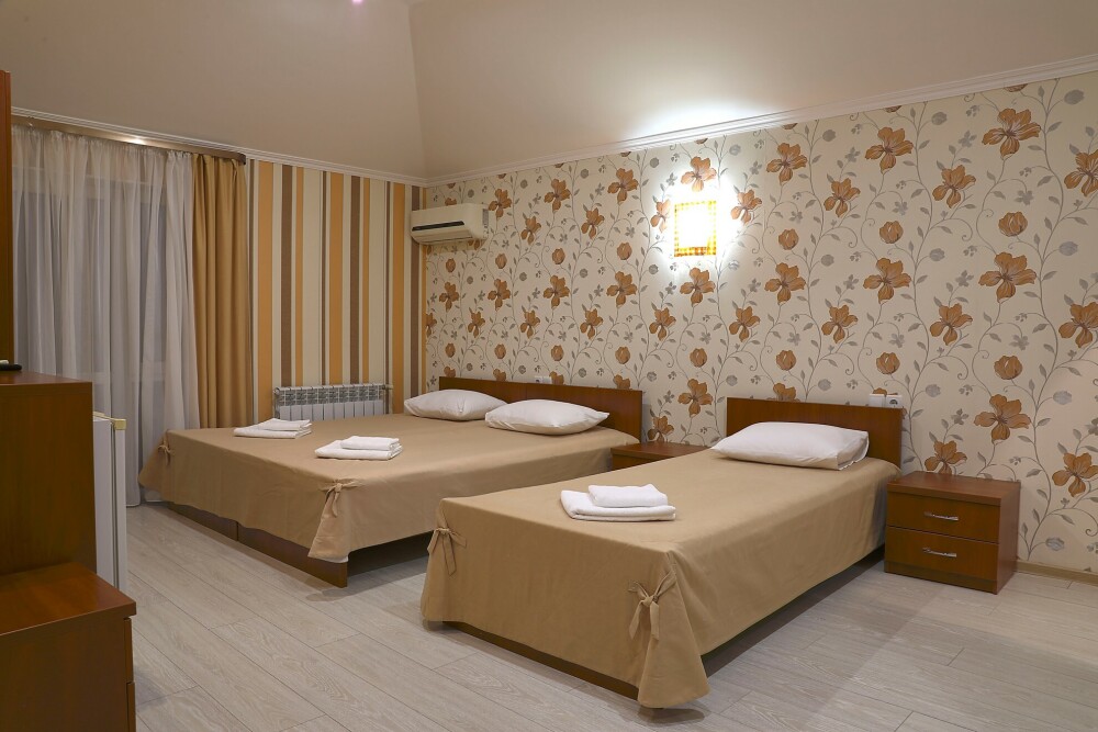 В номере есть кондиционер, холодильник, телевизор, wi-fi, фен, полотенца, стол, тумбочки, шкаф-гардероб. Санузел совмещенный с душевой кабинкой.