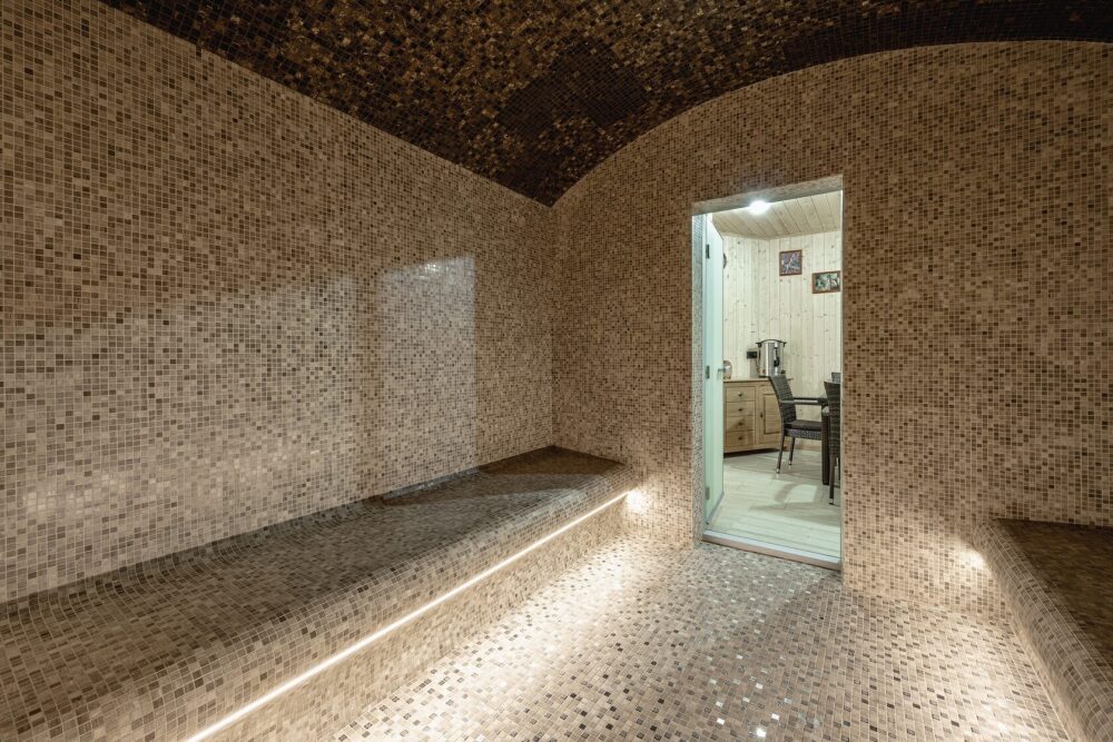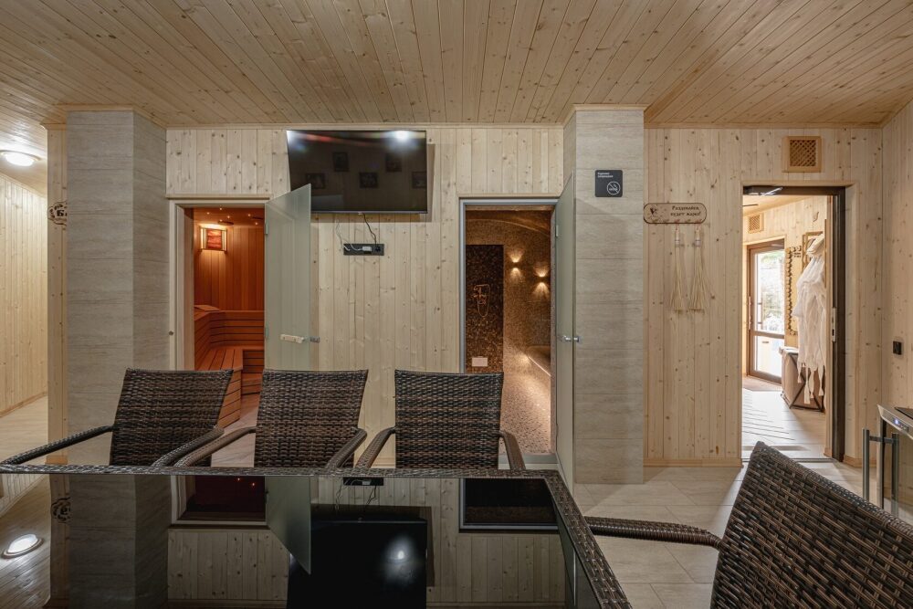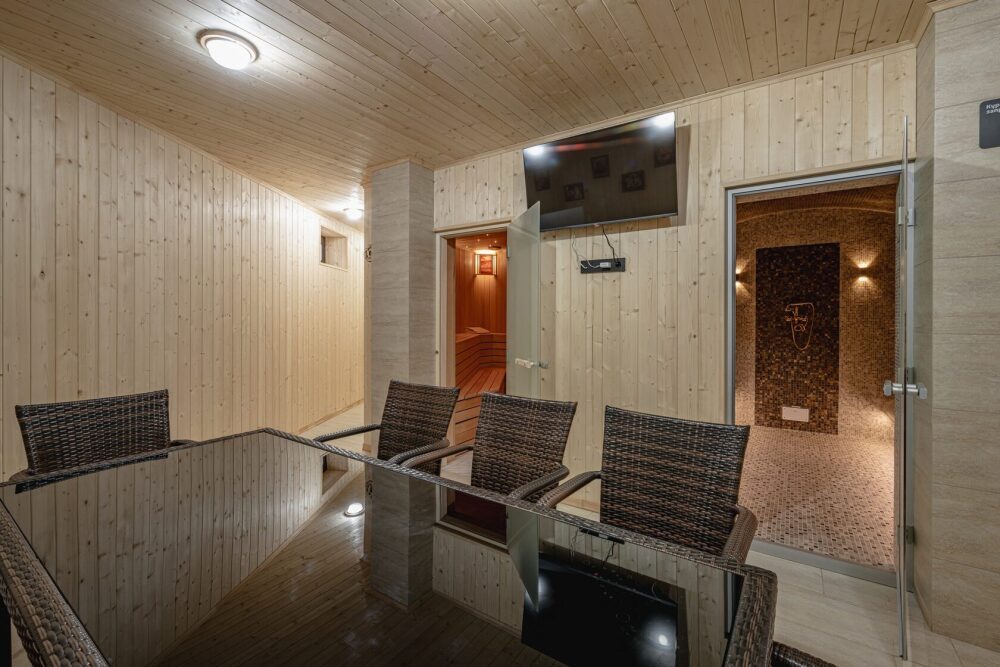 На территории гостевого дома есть общая кухня, которая включает в себя набор необходимой посуды, чайник и микроволновую печь. Во дворе организована площадка барбекю для приготовления мяса и овощей. На территории есть бильярд, а также бассейн, хамам и баня.