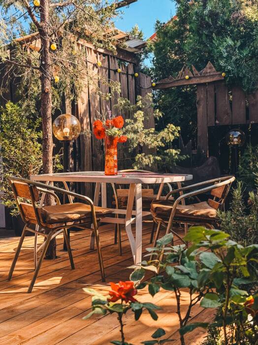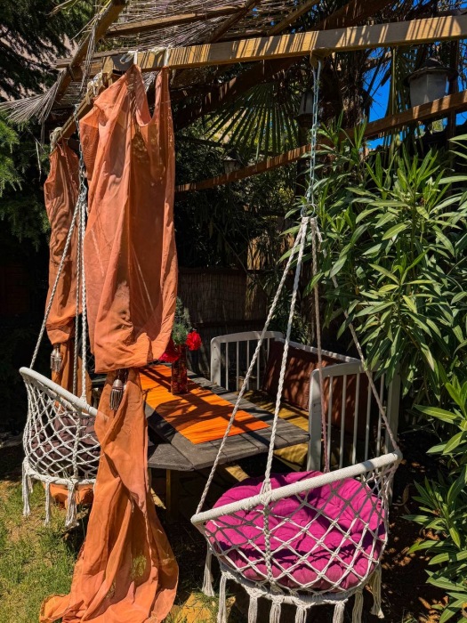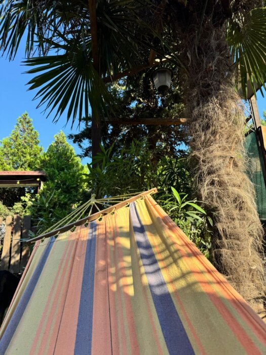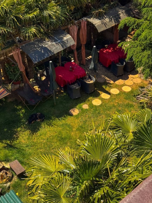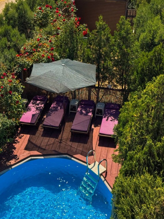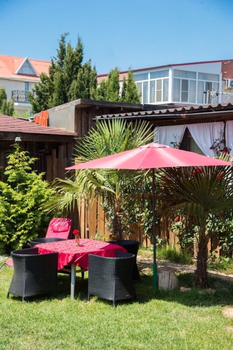 Наши гости начинают день с завтрака на зеленом газоне в окружении прекрасных пальм, отдыхают от экскурсий по Крыму, качаясь в гамаках и загорая у бассейна, проводят вечер в летнем кинотеатре под звездным южным небом с бокалом крымского вина.