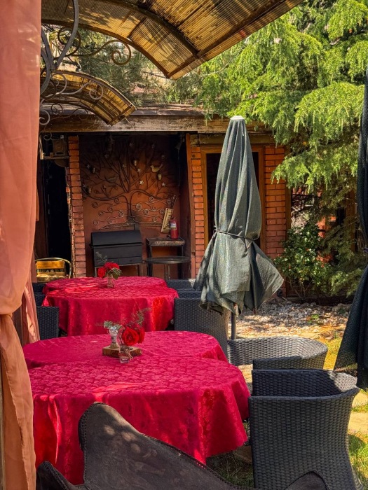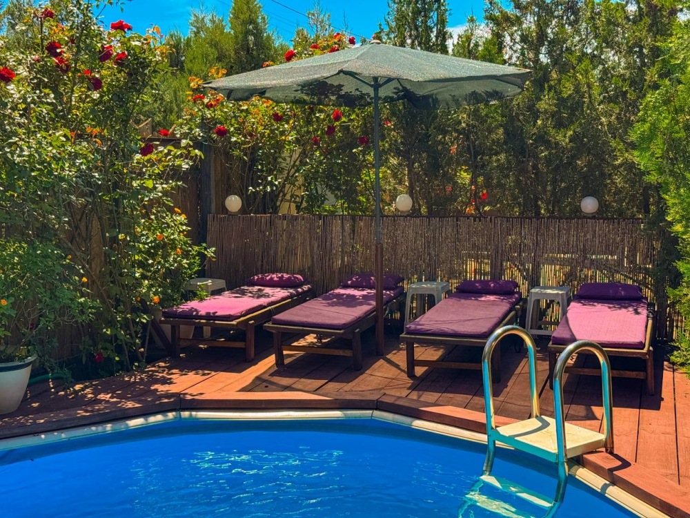 Уютная гостиная зона в стиле старого французского бара с пианино и камином. Библиотека, состоящая из собраний детективов, развлекательной и классической литературы, а также карты Севастополя с описанием главных достопримечательностей города. Бассейн (3.5 м х 5.5 м) с пресной водой, обрамленный деревянным пандусом с шезлонгами для загара и отдыха. Спортивный газон (10м х 10м) с лежачими и сидячими шезлонгами и зонтами для загара и отдыха. Настольный теннис. Мангал-зона с необходимым оборудованием. Wi-Fi на всей территории. Парковка.