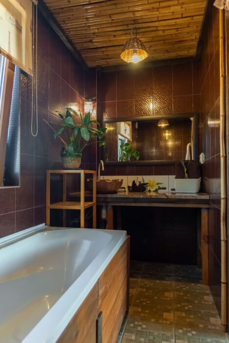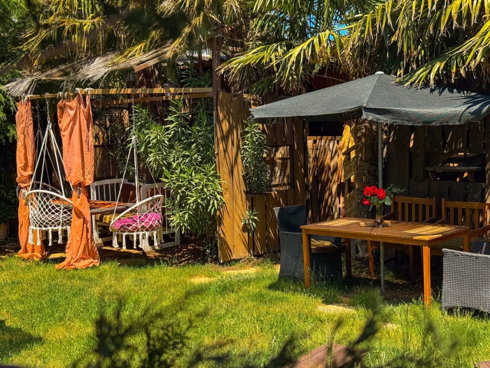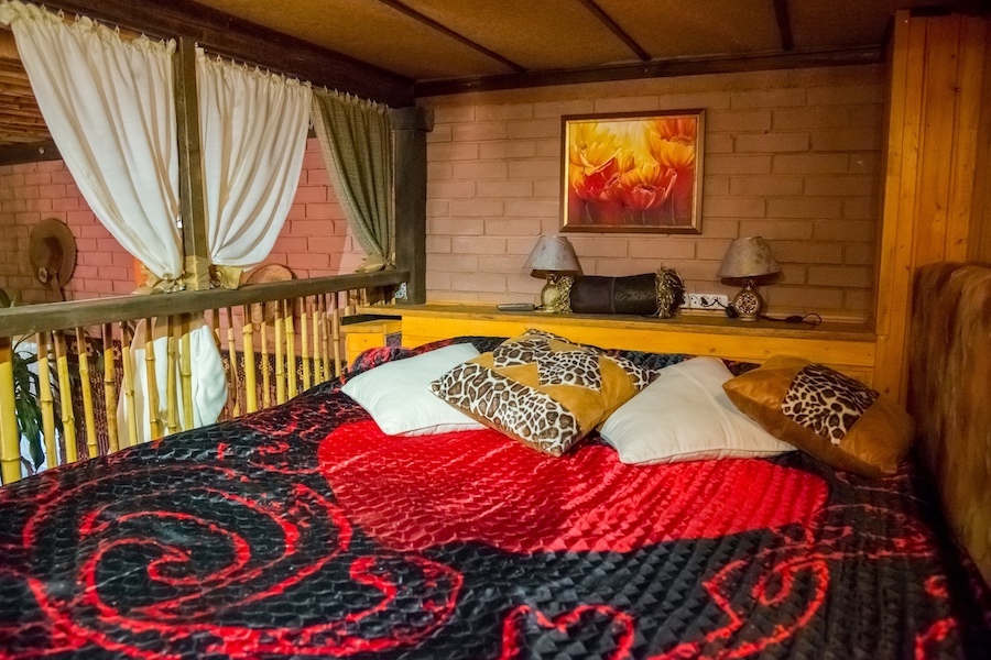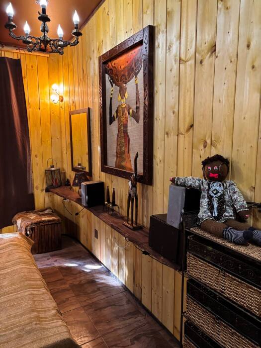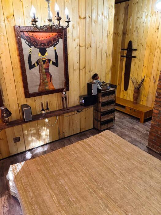 Отдельностоящий дом в африканском стиле. Спальня, кухня гостиная и большая веранда. Ротацнговая мебель , гамак и множество интересных деталей. Полноценная кухня и 2 санузла с душевыми. Принимаем детей с 13 лет.