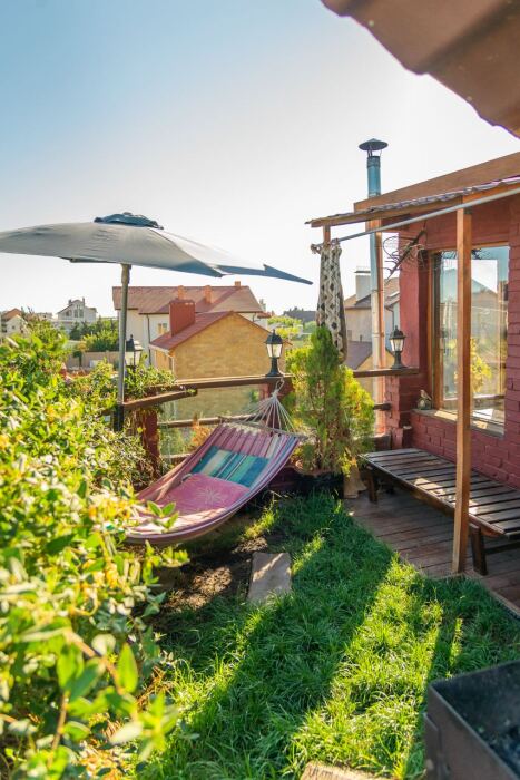 Состоит из двух спален, гостиной и кухни-студии с выходом на террасу с газоном. У номера собственная мангальная зона.