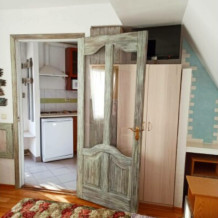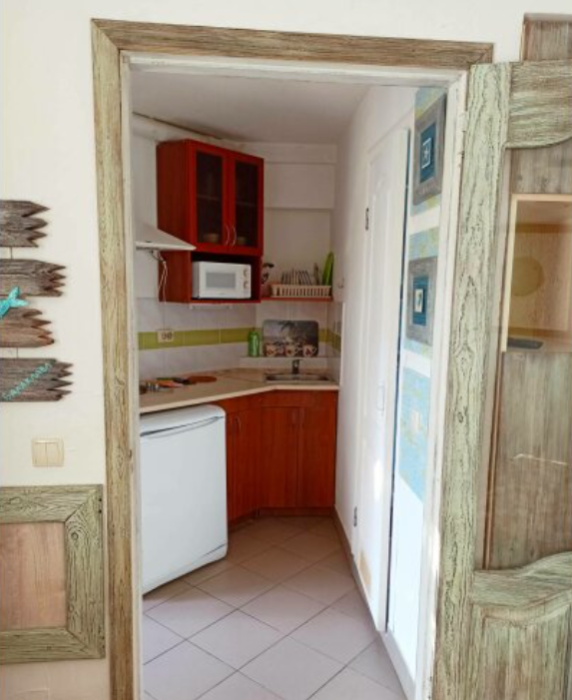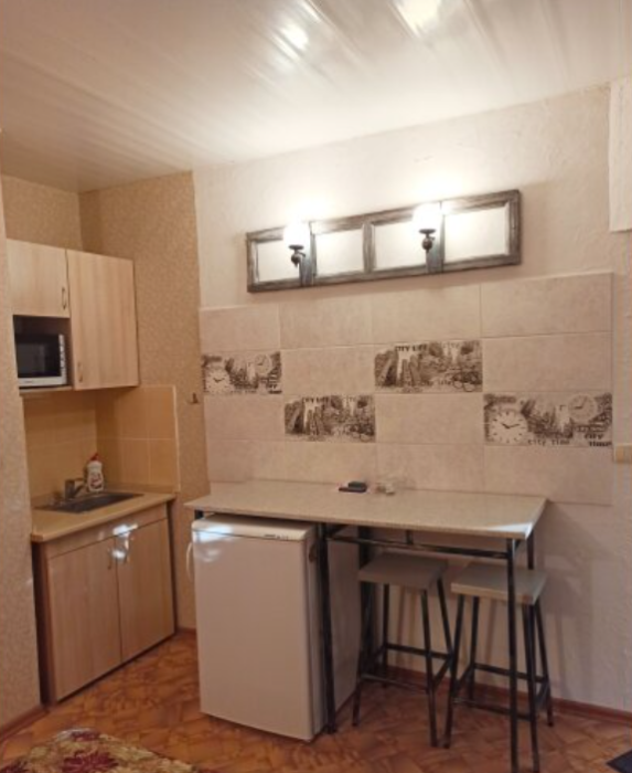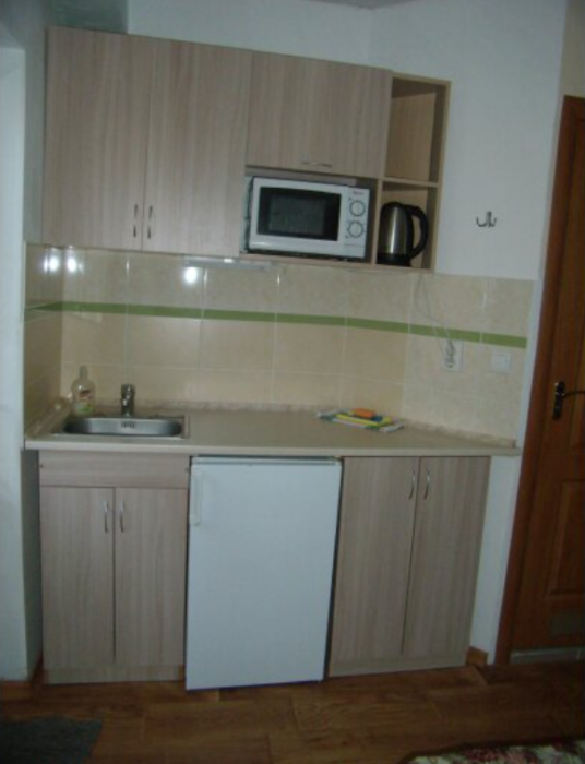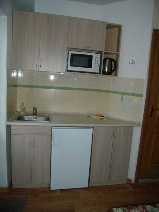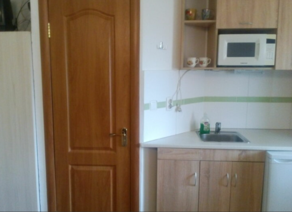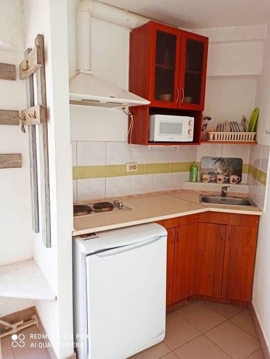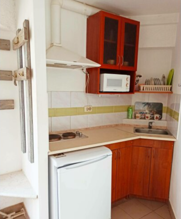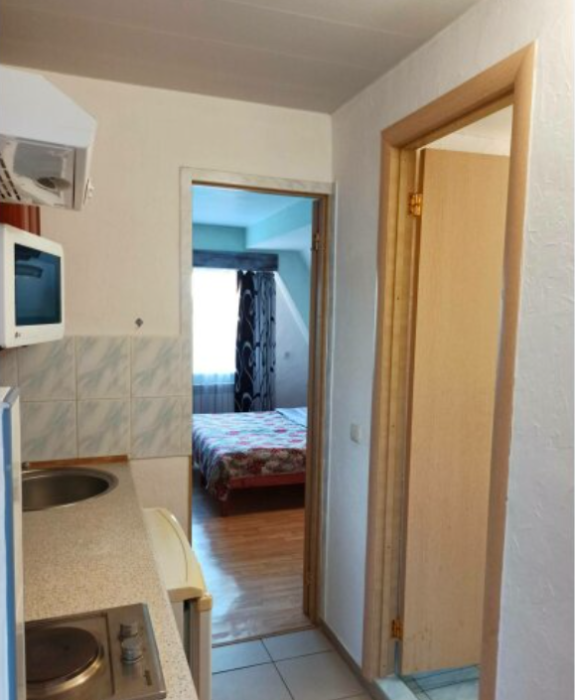 Номер № 2 на первом этаже гостевого домика. Маленький номер для одного или двух человек. В номере есть мини кухня: холодильник, СВЧ печь, мойка, посуда, эл. чайник. В номере вентилятор.