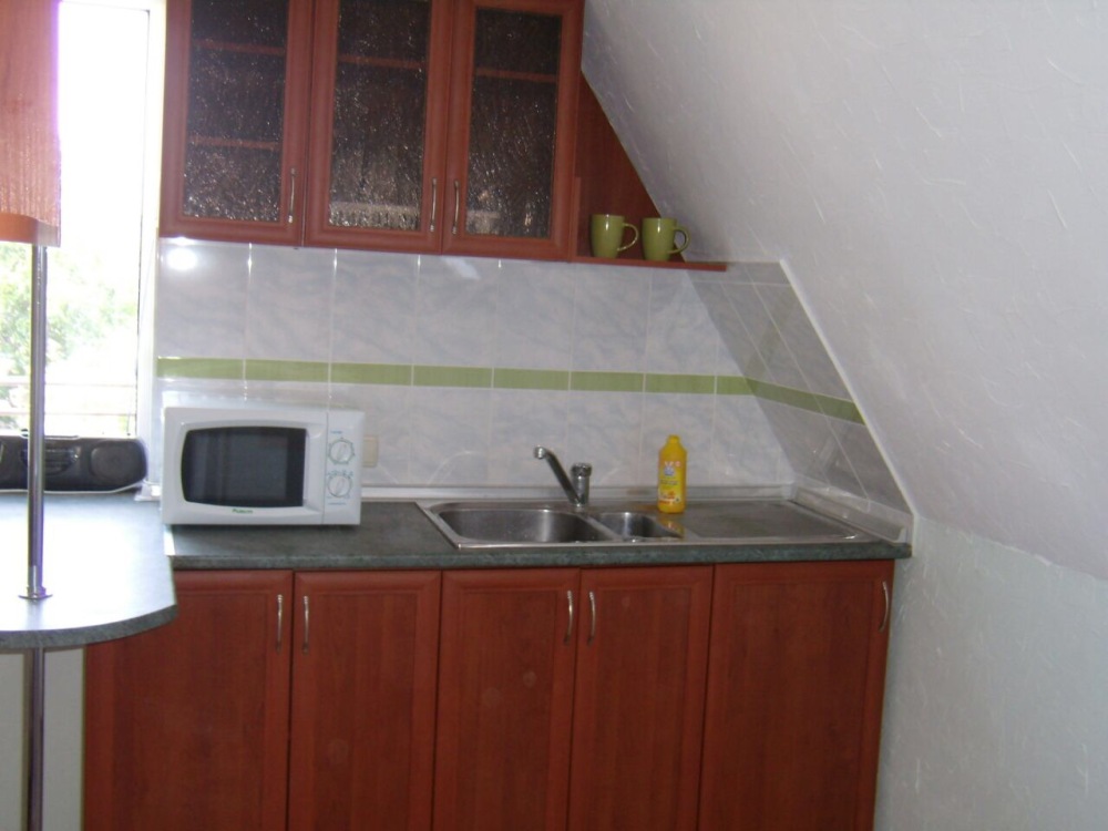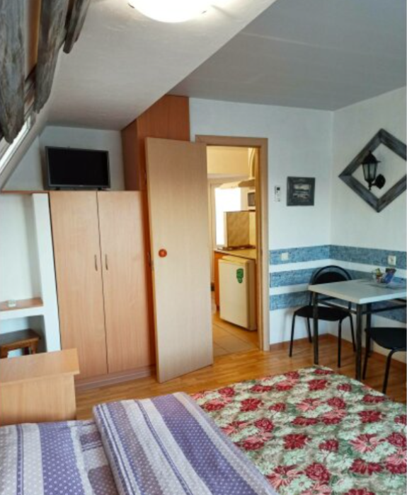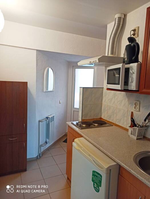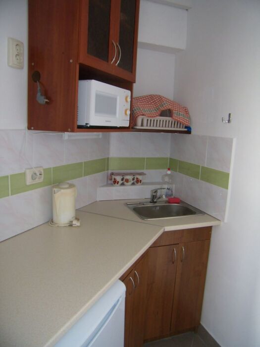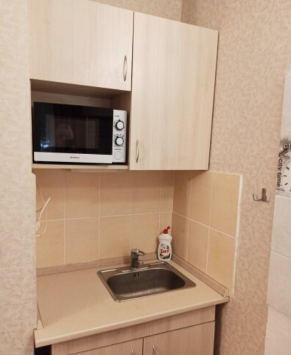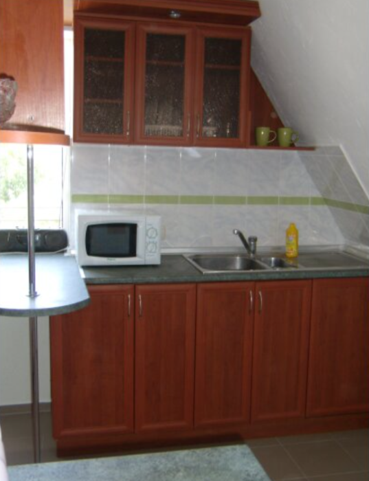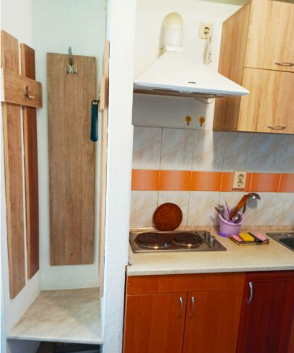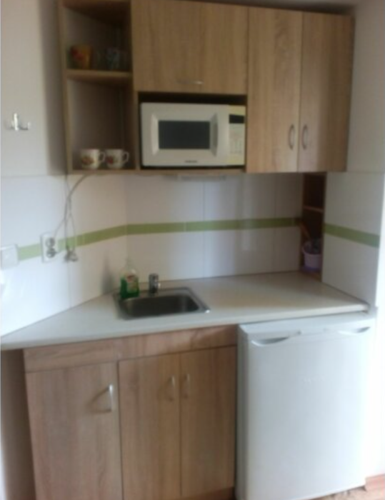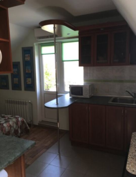Номер № 2 на первом этаже гостевого домика. Маленький номер для одного или двух человек. В номере есть мини кухня: холодильник, СВЧ печь, мойка, посуда, эл. чайник. В номере вентилятор.