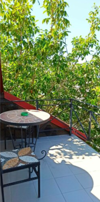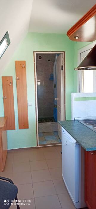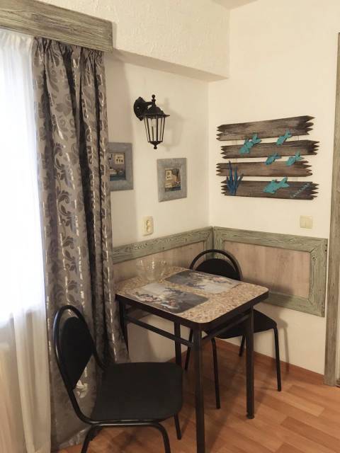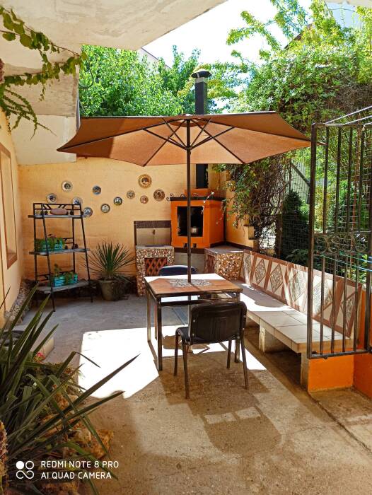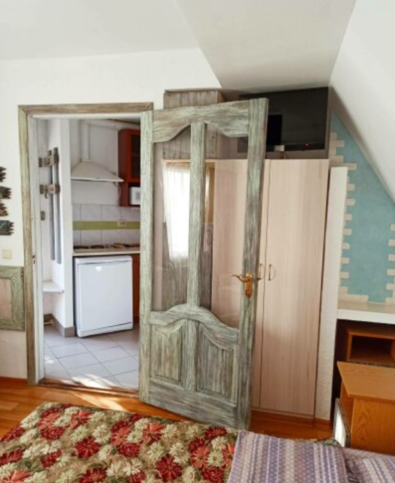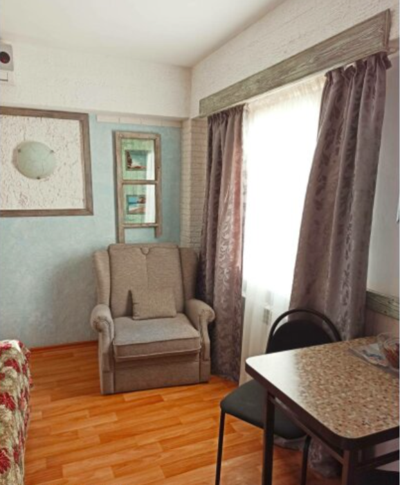 Номер №1 на первом этаже гостевого домика. Небольшой номер для одного или двух человек. В номере есть мини кухня: холодильник, СВЧ печь, мойка, посуда, эл. чайник. В номере есть свой санузел с душем. Постельное белье и полотенца предоставляются. Во время проживания гостя в номере, уборка не проводится. Во дворике, рядом с номером, есть зона отдыха со столом и стульями, кухонный блок с эл. плитой и мангальная зона.
