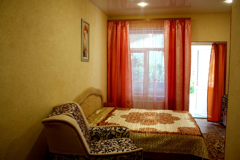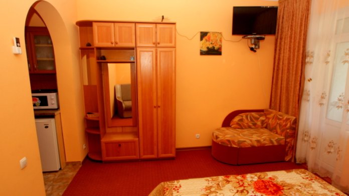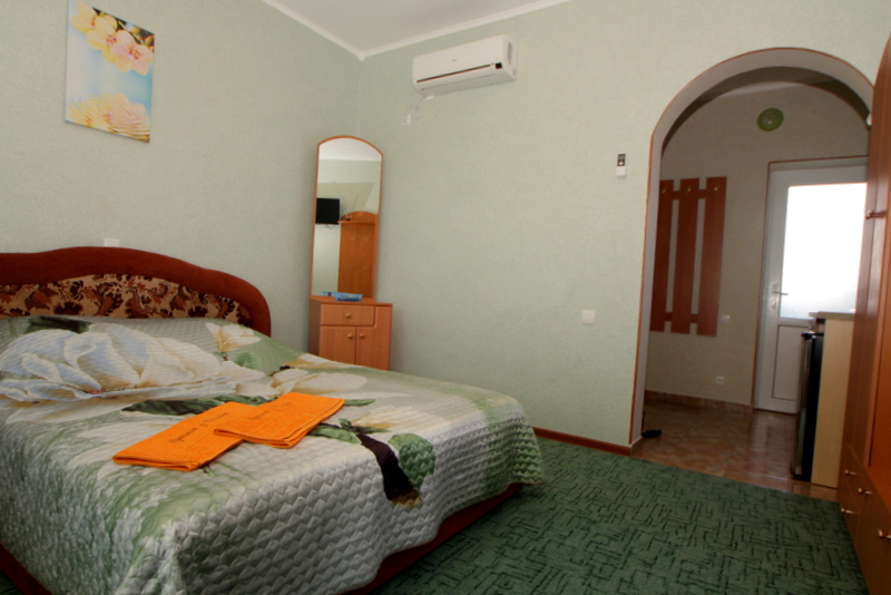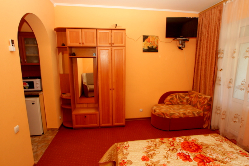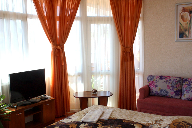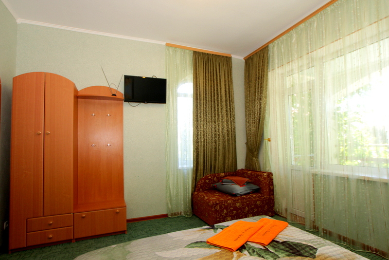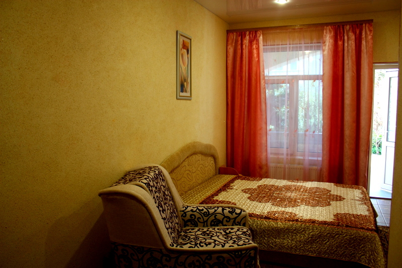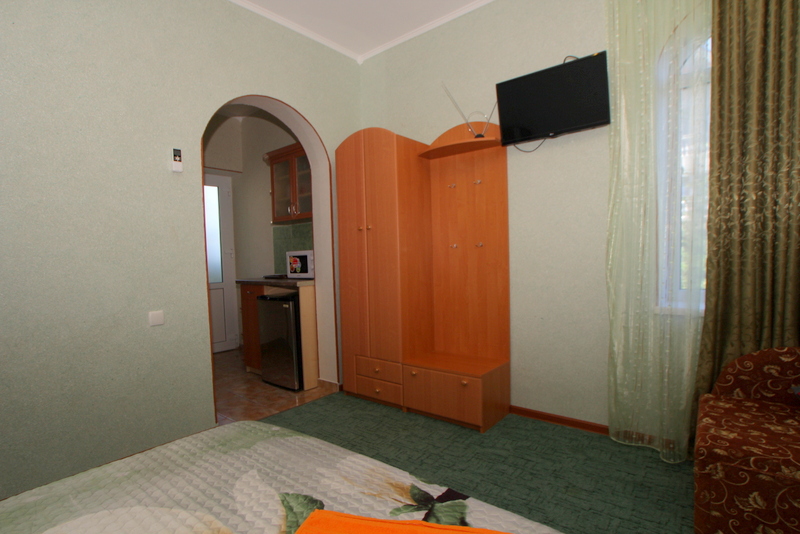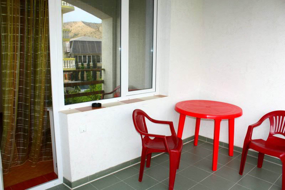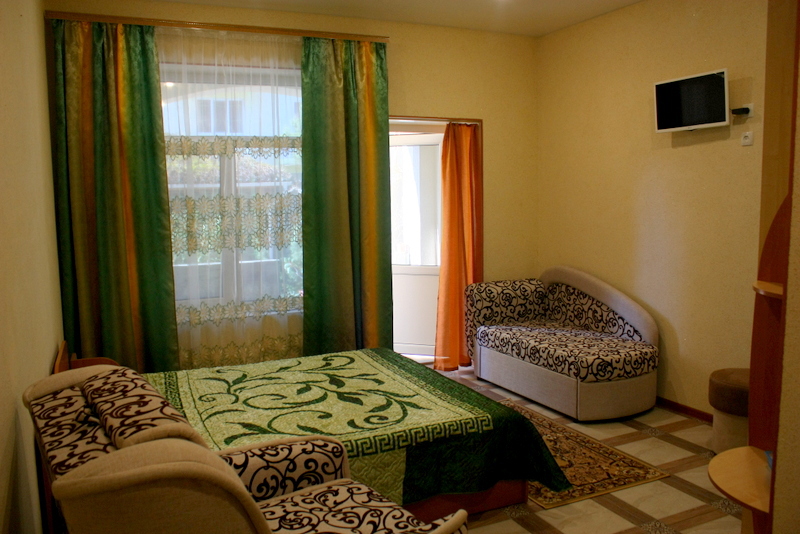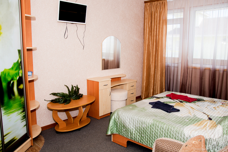 Номер выполнен по европейскому стандарту с индивидуальным, ярким дизайном и оборудован сплит-системой, санузлом, телевизором и удобной мягкой мебелью. Для удобства в номерах есть шкафы, прикроватные тумбочки и трюмо. С балконов номеров, оборудованных мебелью, можно любоваться чарующей горой Алчак и прекрасным видом зеленого двора нашей мини-гостиницы.