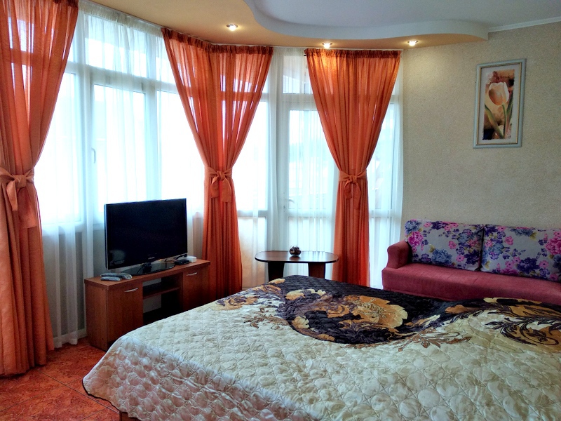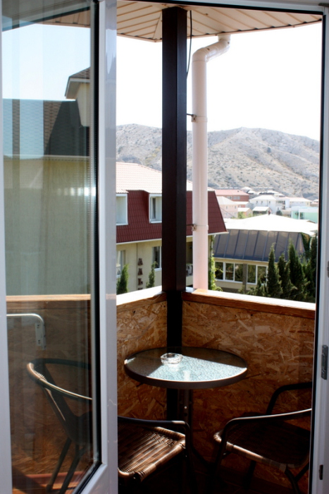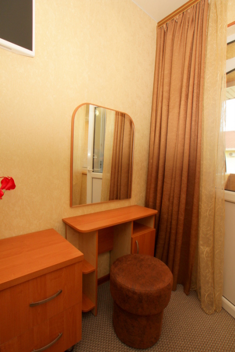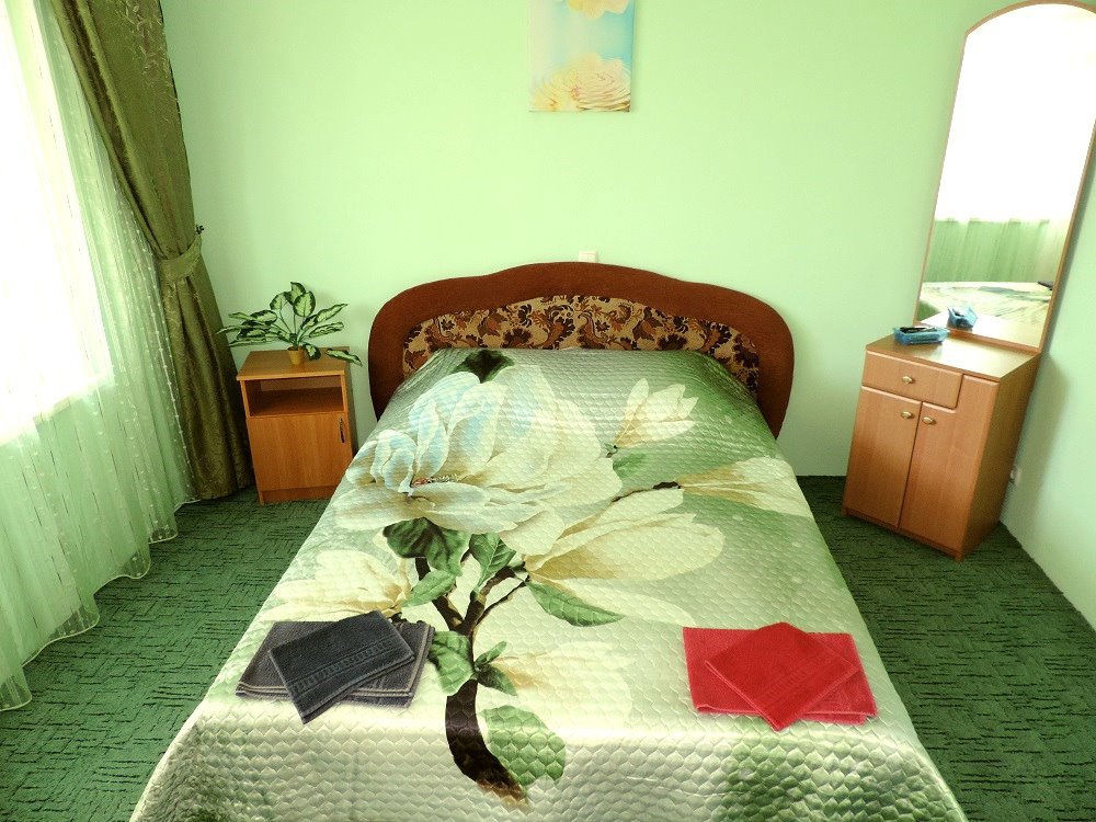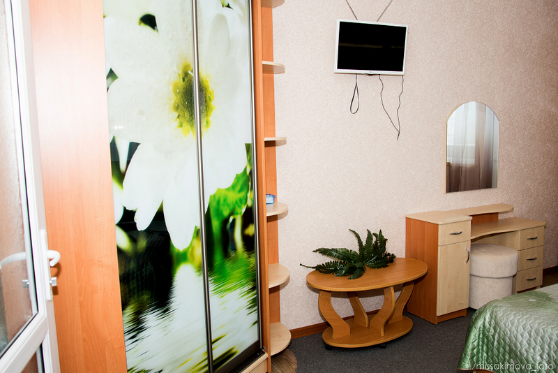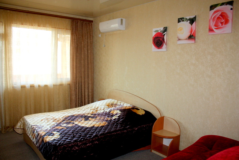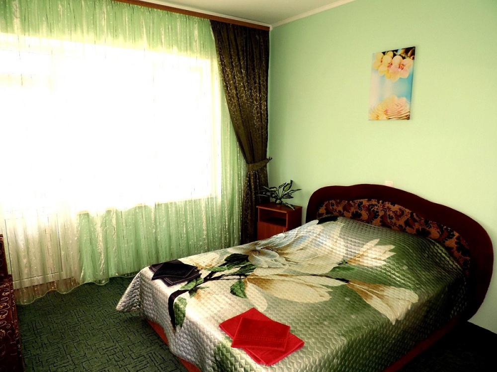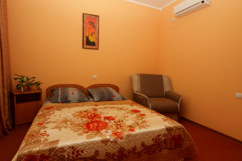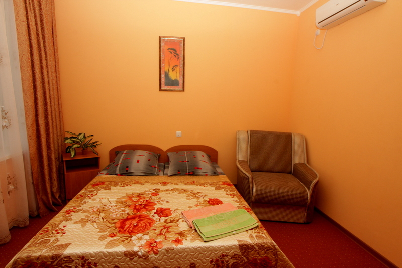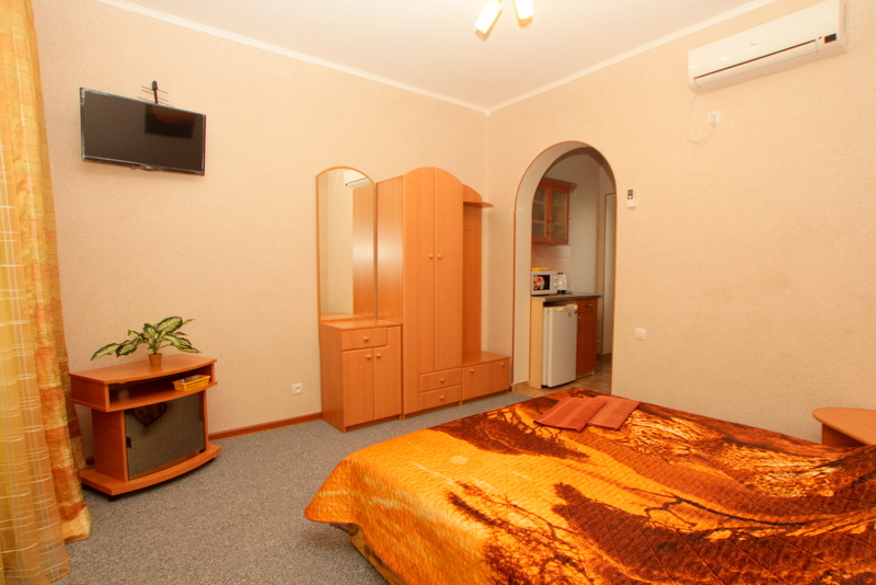 Номер выполнен по европейскому стандарту с индивидуальным, ярким дизайном и оборудован сплит-системой, санузлом, телевизором и удобной мягкой мебелью. Для удобства в номерах есть шкафы, прикроватные тумбочки и трюмо. С балконов номеров, оборудованных мебелью, можно любоваться чарующей горой Алчак и прекрасным видом зеленого двора нашей мини-гостиницы.