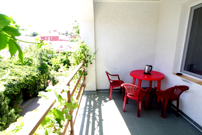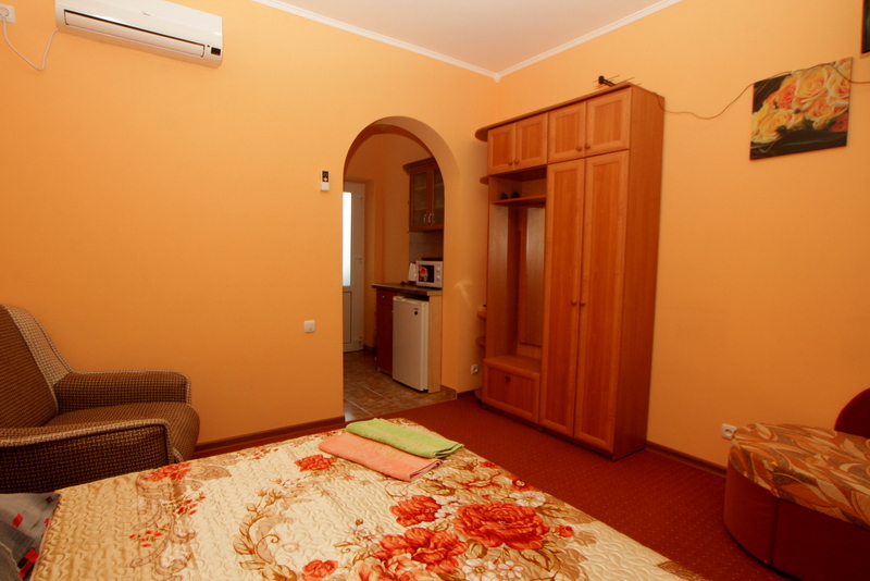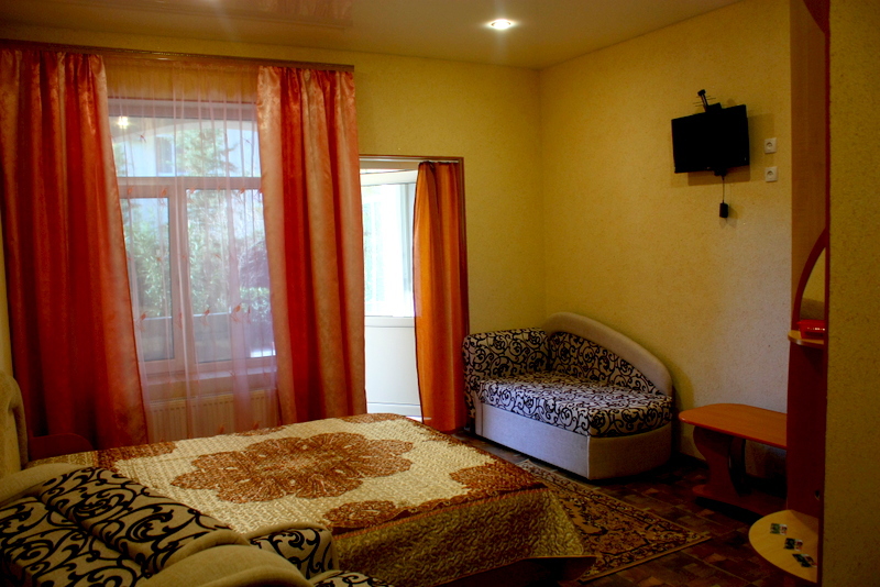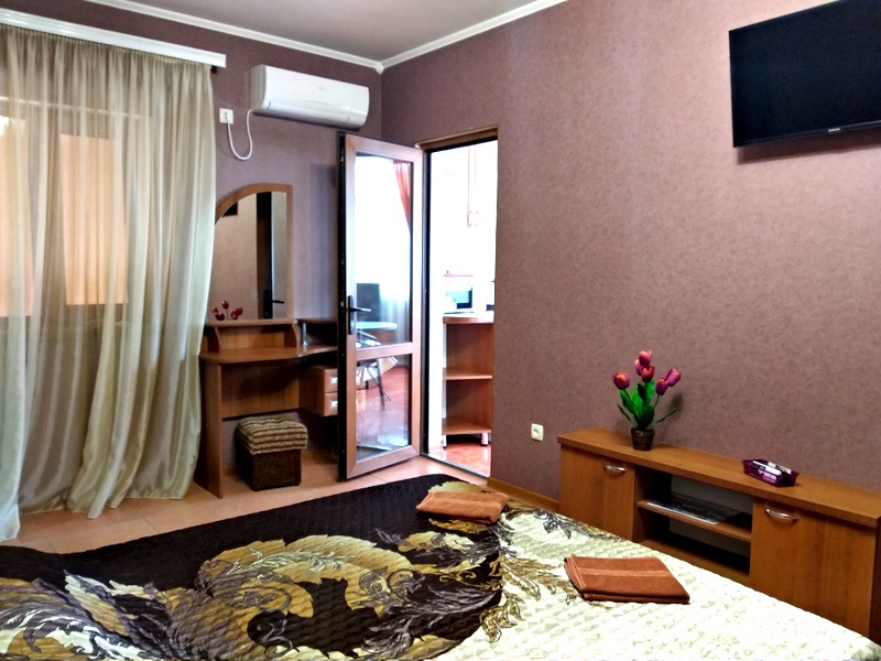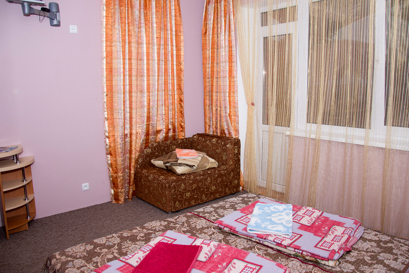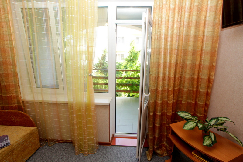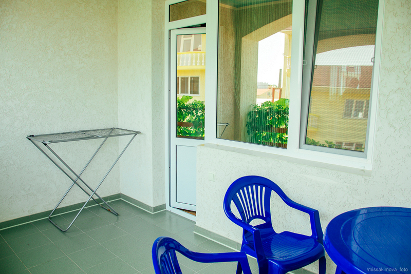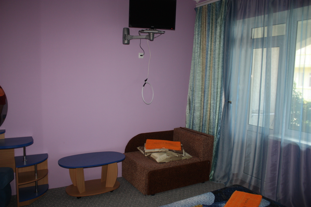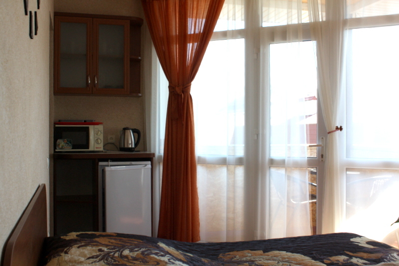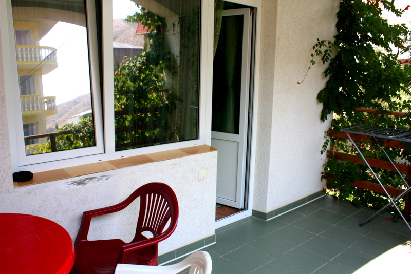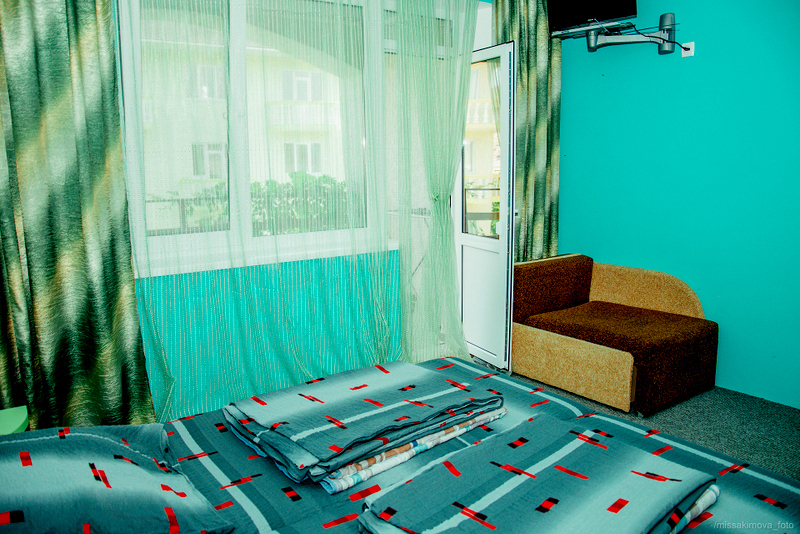 Номер 2-местный с дополнительным местом (большой диван-книжка), расположен на четвертом этаже, имеет отдельный вход. В номере есть душ и санузел (горячая и холодная вода круглосуточно), есть телевизор LCD, кондиционер, холодильник, микроволновая печь, эл.чайник, посуда, сейф. Имеется балкон, где стоит летняя мебель для отдыха, сушилка для белья. Предоставляем постельное белье и полотенца.