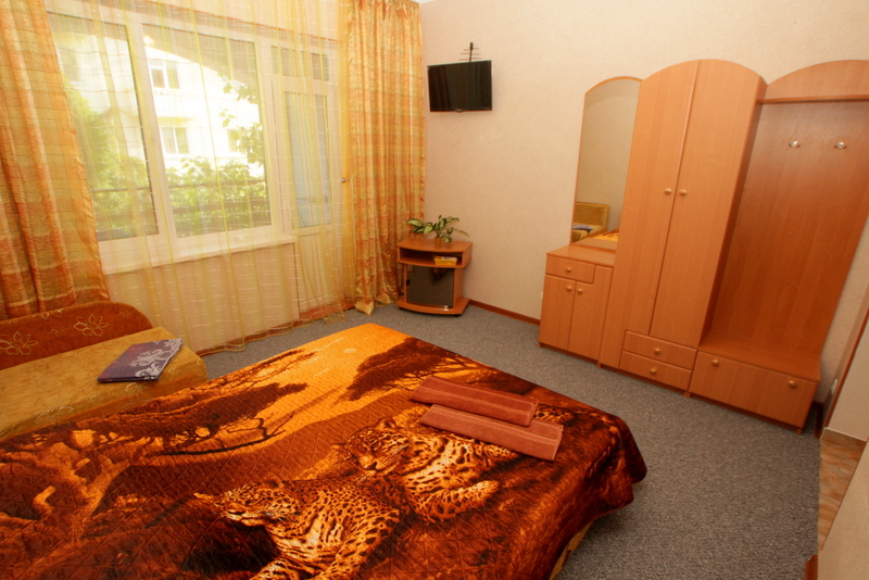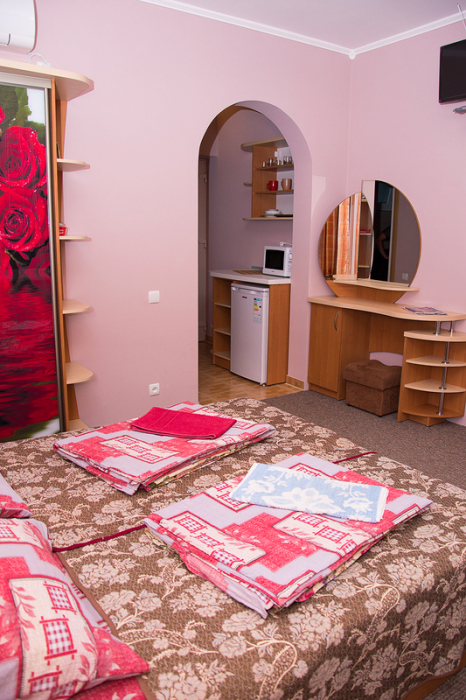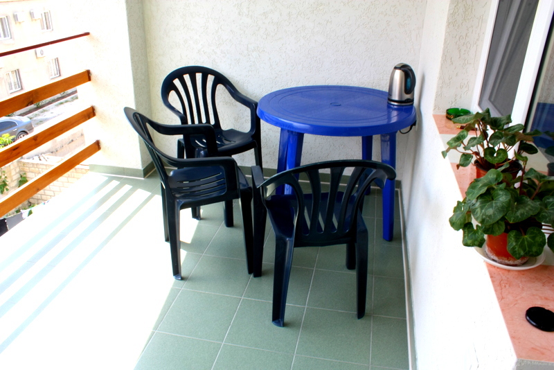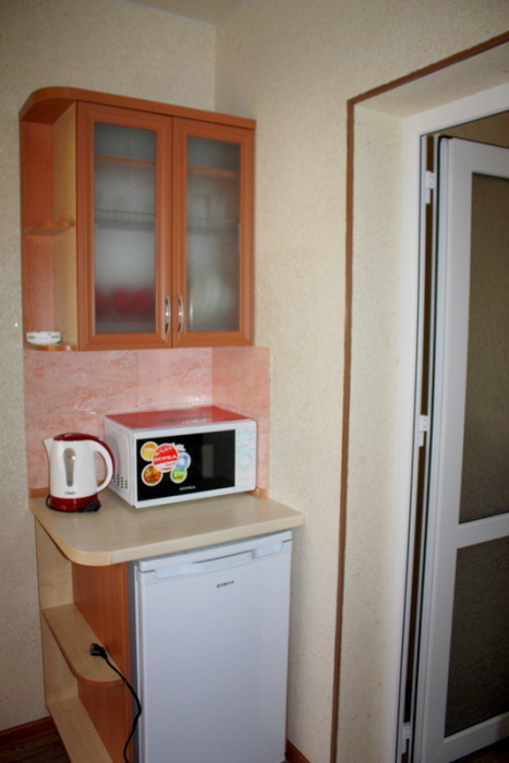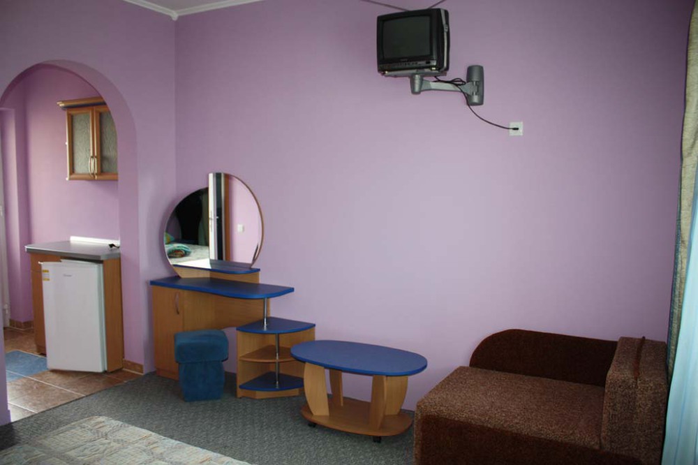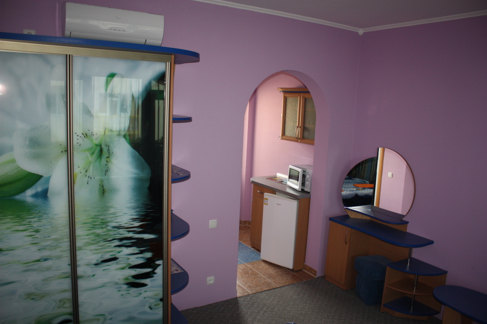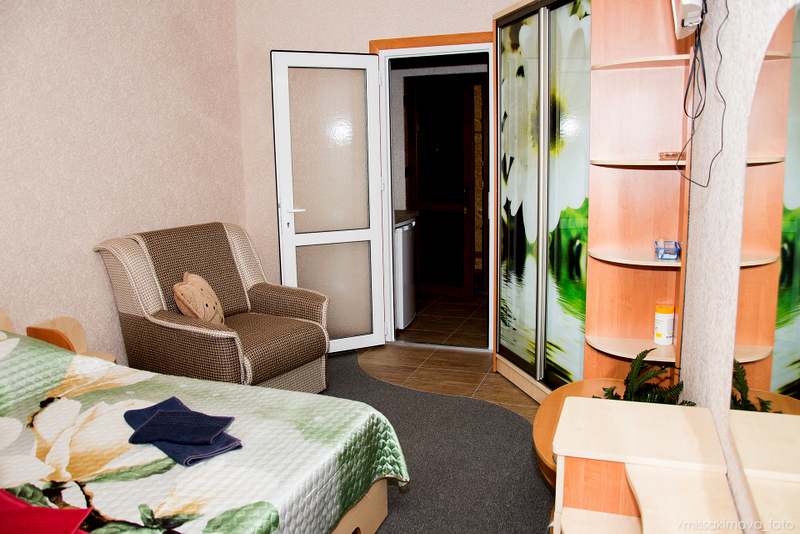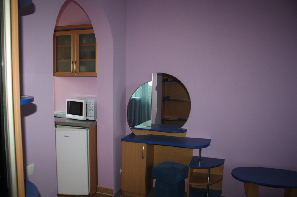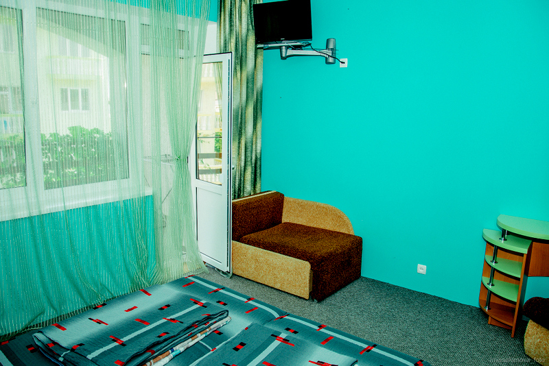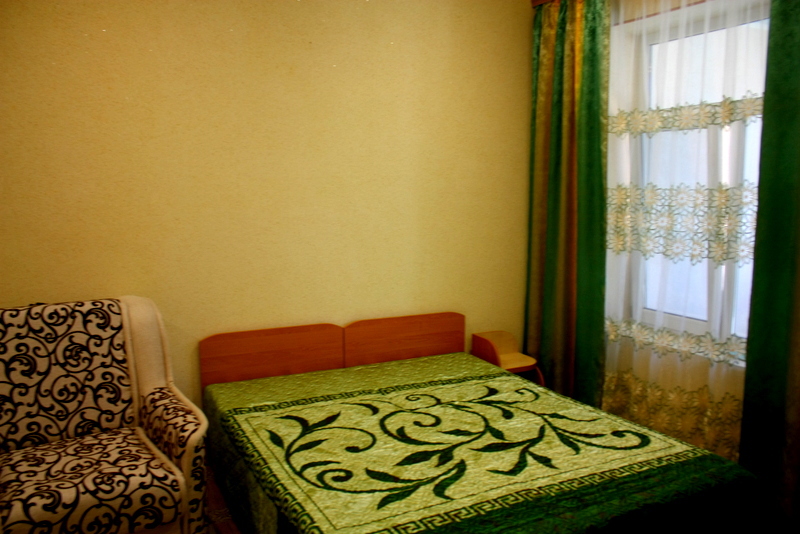 Номер 2-местный с дополнительным местом (большой диван-книжка), расположен на четвертом этаже, имеет отдельный вход. В номере есть душ и санузел (горячая и холодная вода круглосуточно), есть телевизор LCD, кондиционер, холодильник, микроволновая печь, эл.чайник, посуда, сейф. Имеется балкон, где стоит летняя мебель для отдыха, сушилка для белья. Предоставляем постельное белье и полотенца.
