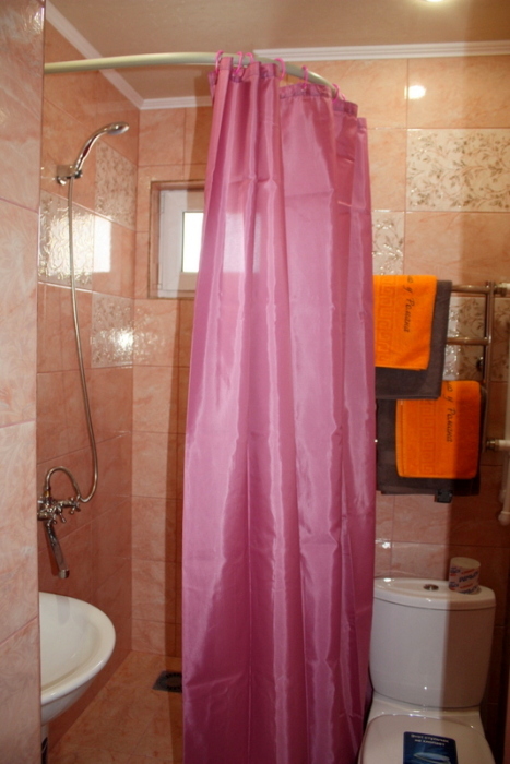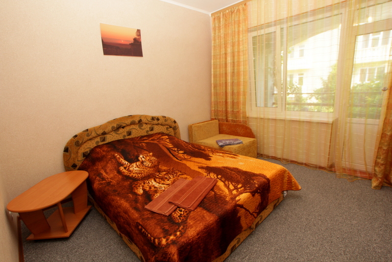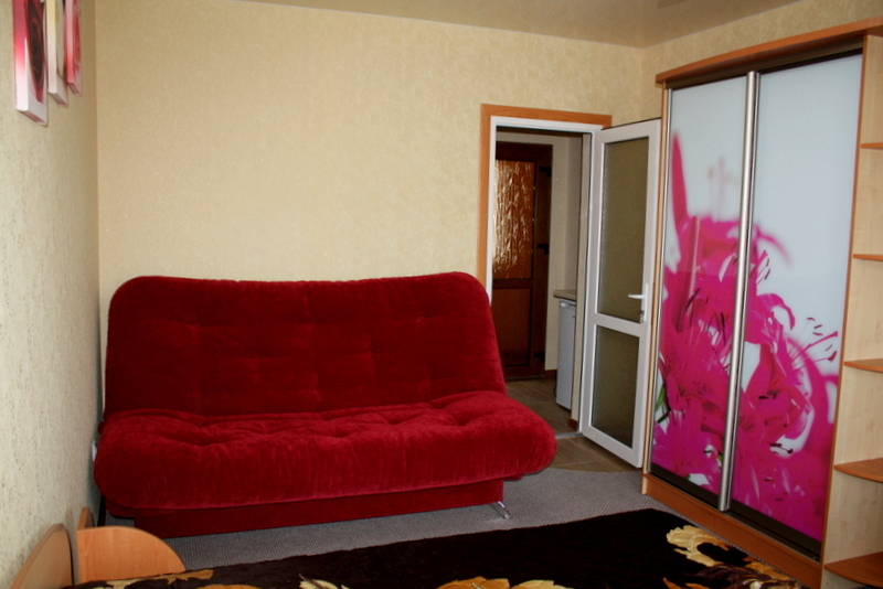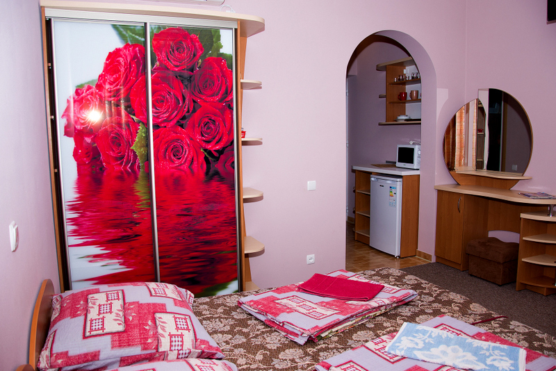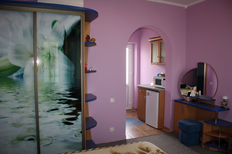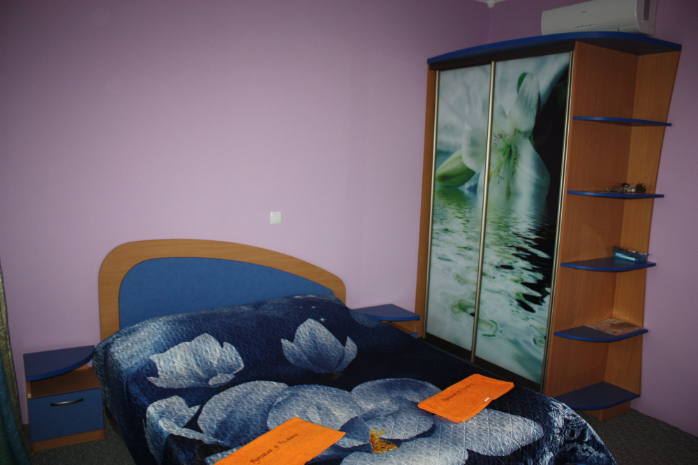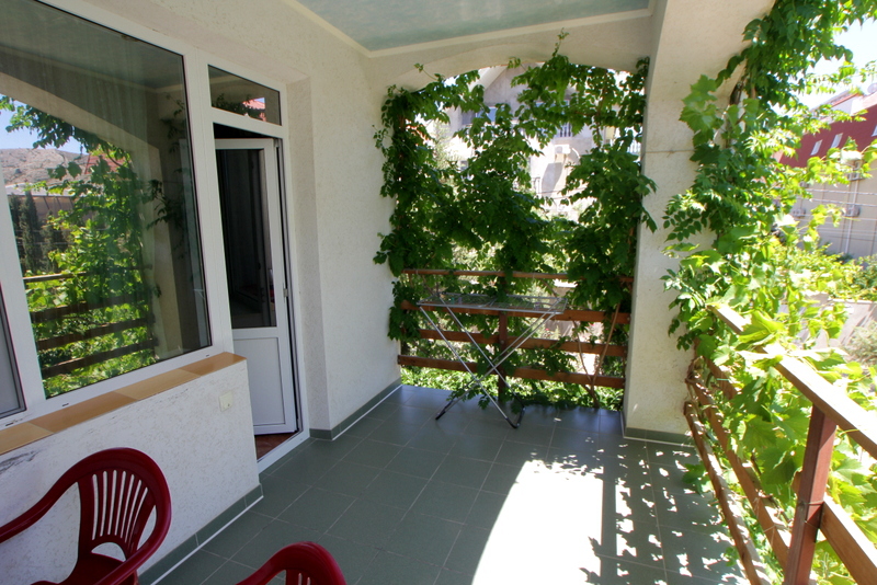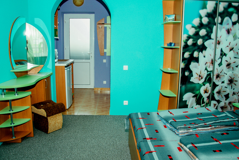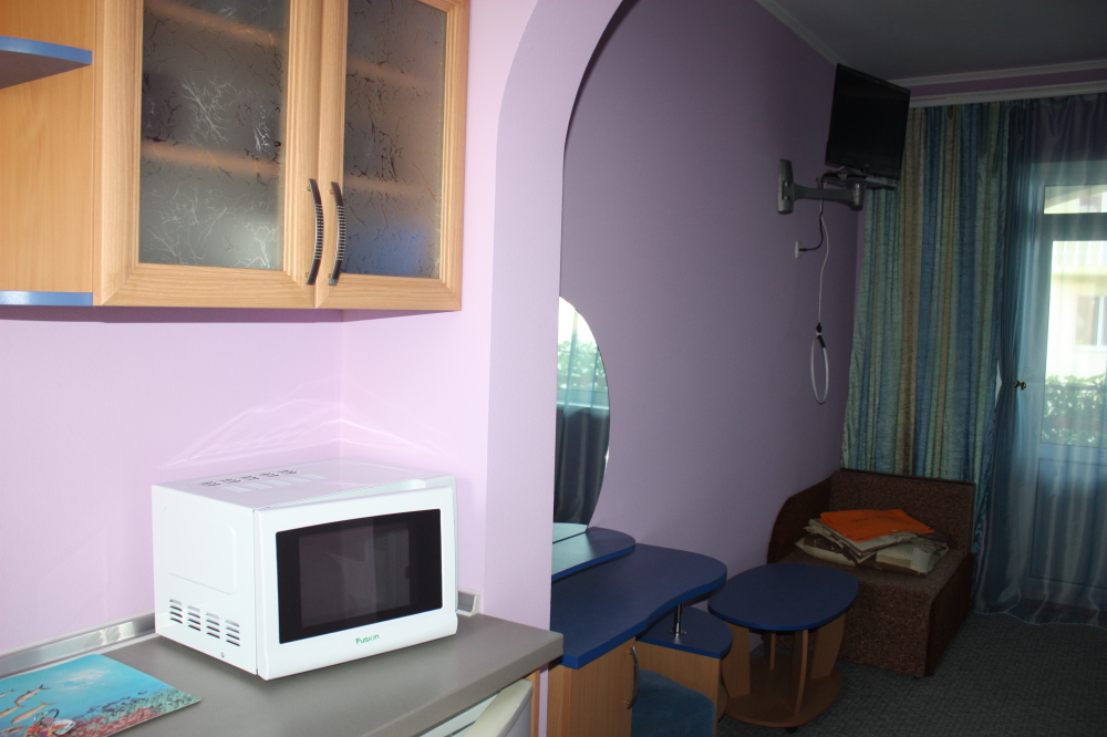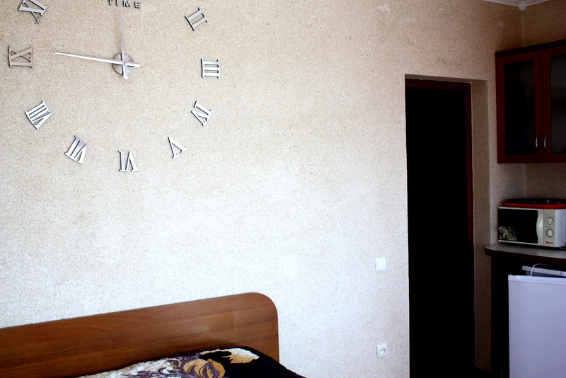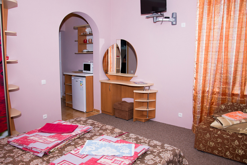 Номер 2-местный с дополнительным местом (большой диван-книжка), расположен на четвертом этаже, имеет отдельный вход. В номере есть душ и санузел (горячая и холодная вода круглосуточно), есть телевизор LCD, кондиционер, холодильник, микроволновая печь, эл.чайник, посуда, сейф. Имеется балкон, где стоит летняя мебель для отдыха, сушилка для белья. Предоставляем постельное белье и полотенца.