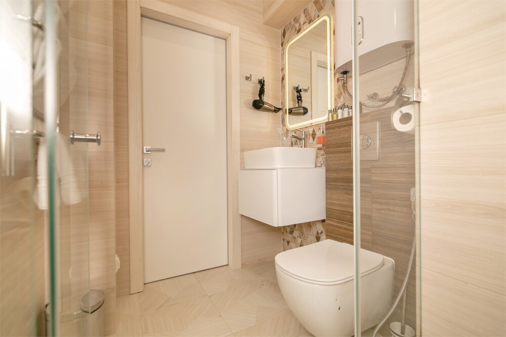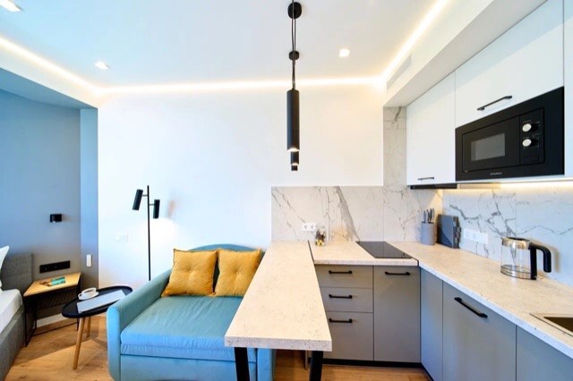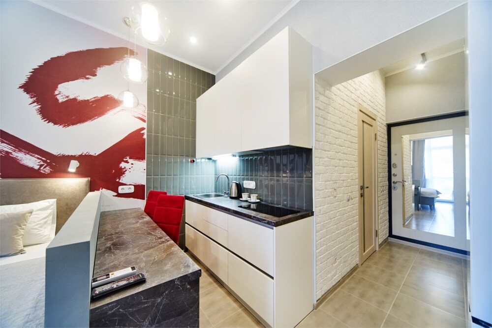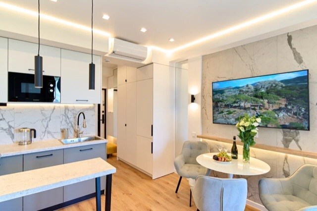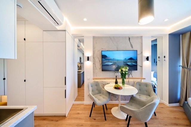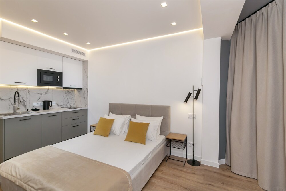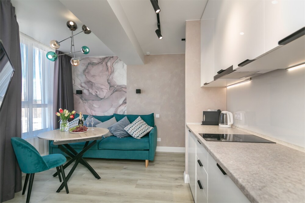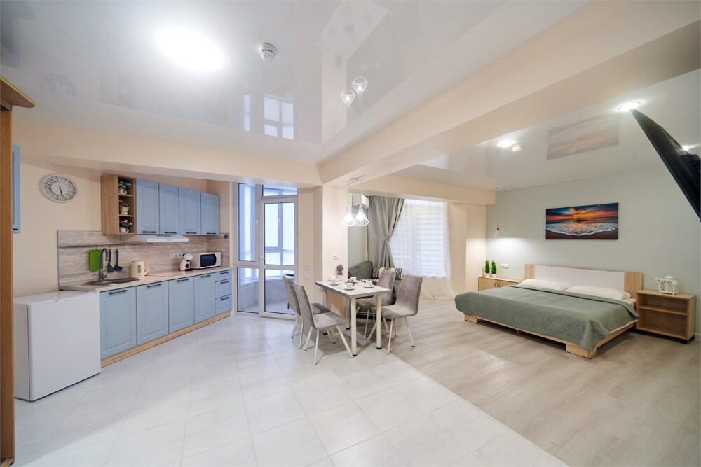 Каждая деталь в апартаментах продумана для Вашего комфорта: современная кухонная зона для приготовления любимых блюд, обеденная зона для уютных завтраков, телевизор для вечернего отдыха и бесплатный Wi-Fi для связи. В Вашем распоряжении холодильник, фен, мягкое постельное белье и банные принадлежности, а также мини-парфюмерия и тапочки для Вашего абсолютного удобства.