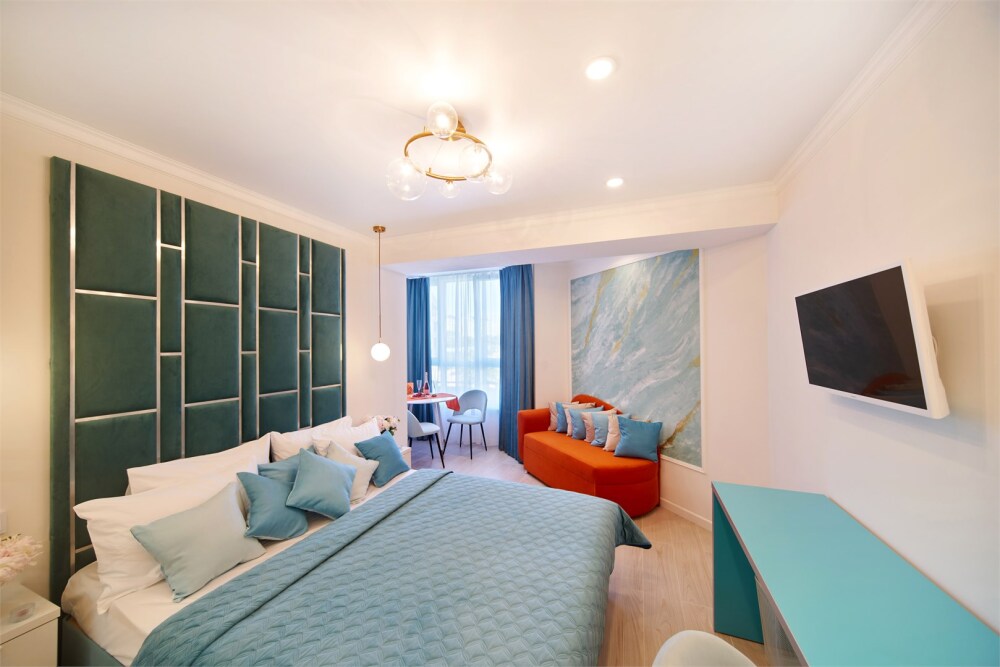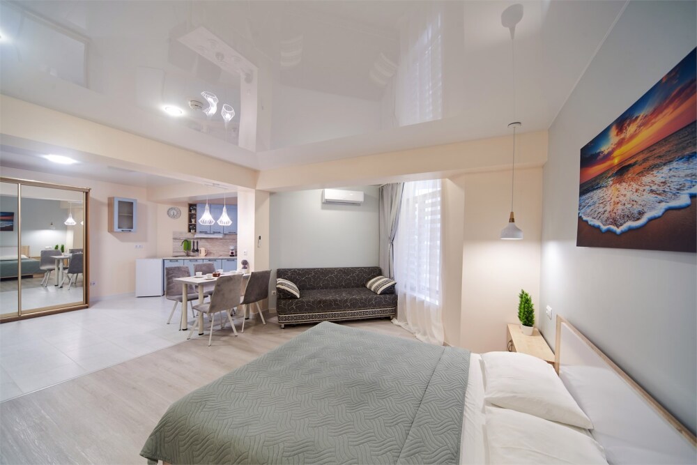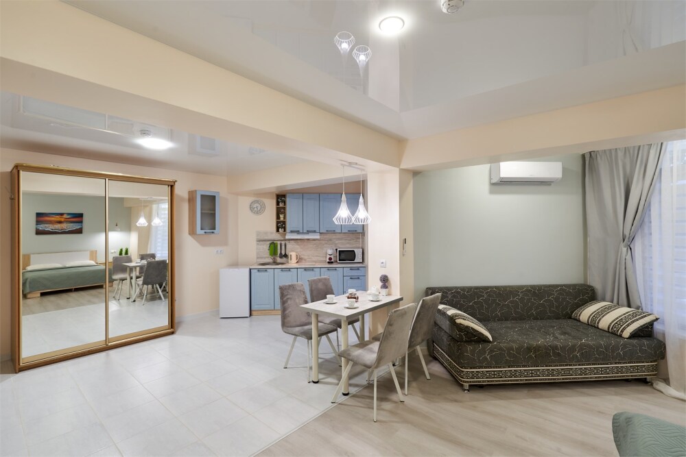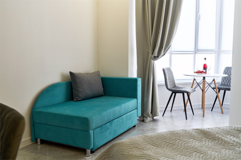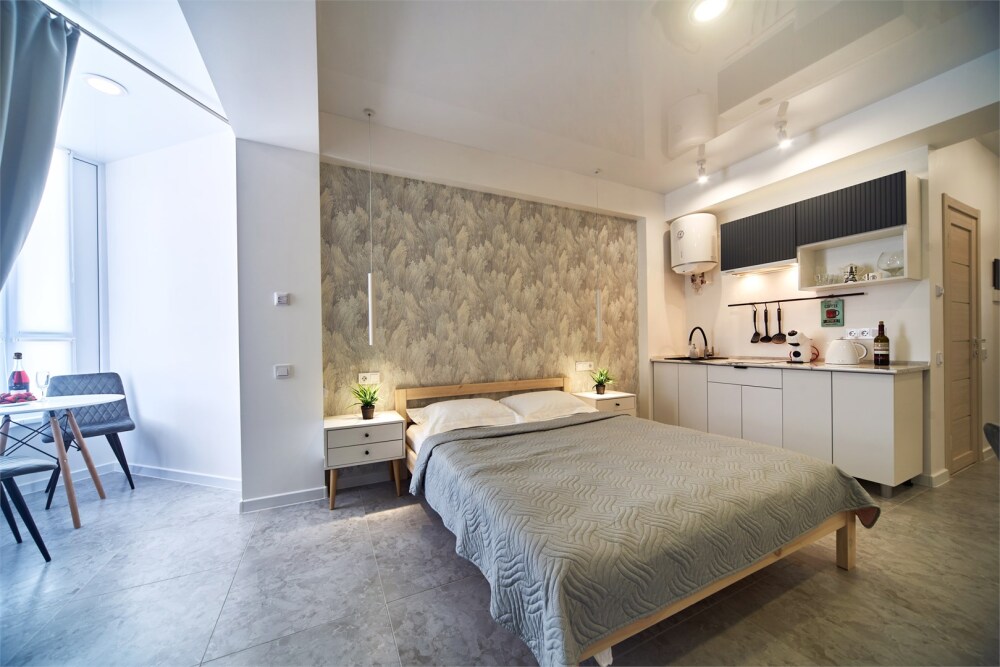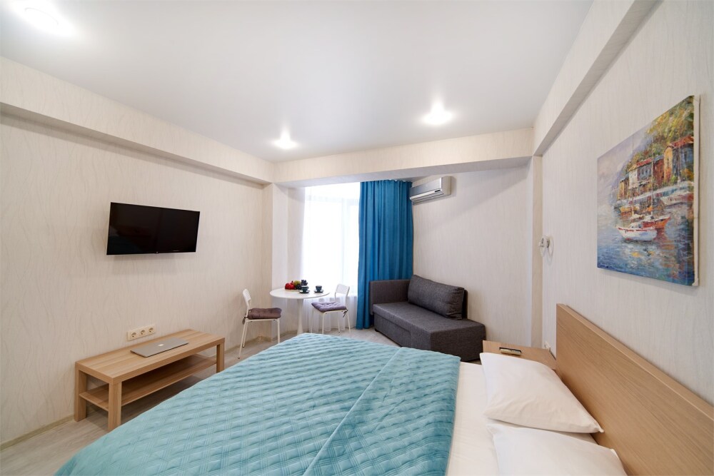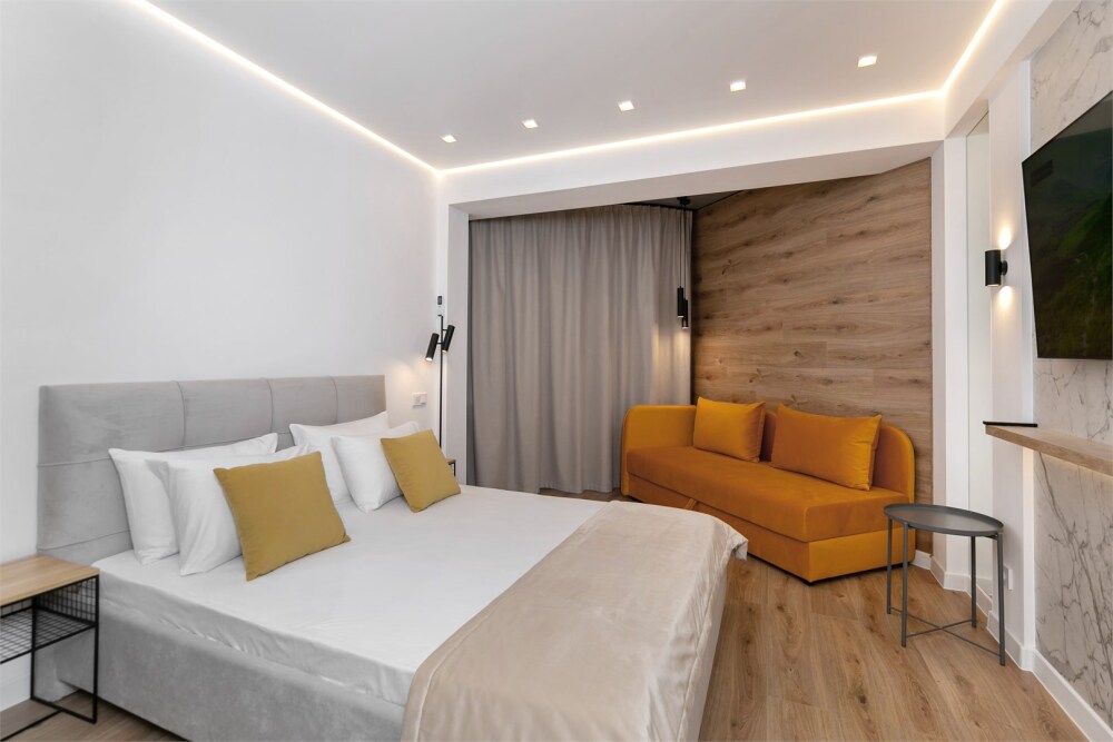 Вас ждёт уютная спальня с удобной двуспальной кроватью и раскладным диваном, что делает эти апартаменты идеальными для одного или двух взрослых, с возможностью организации дополнительного места.