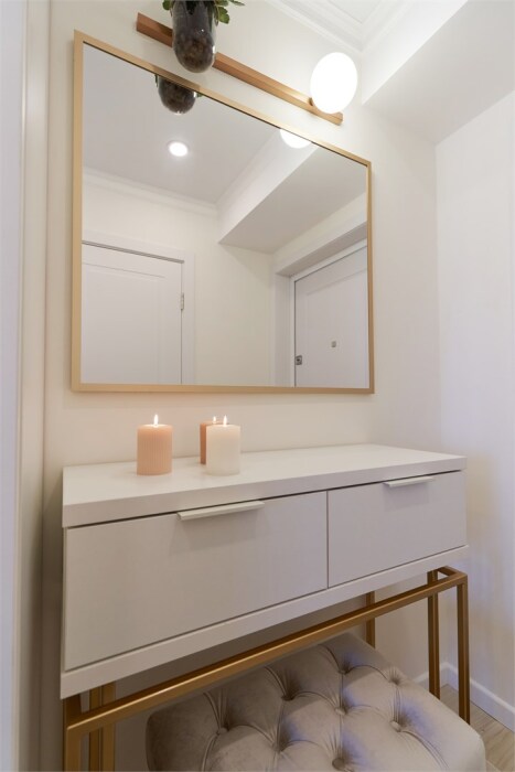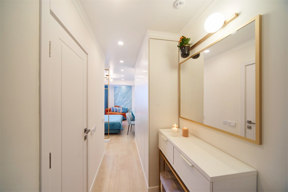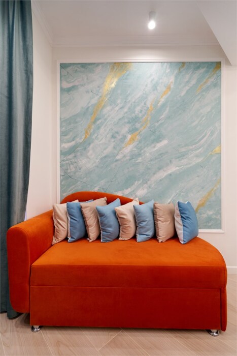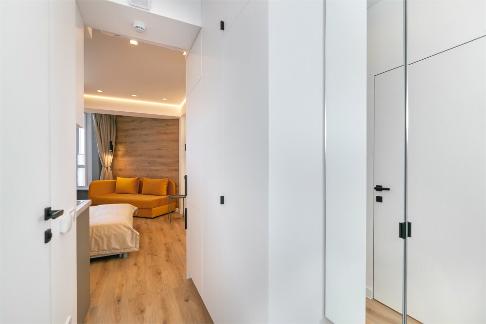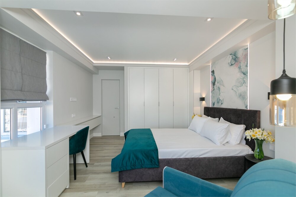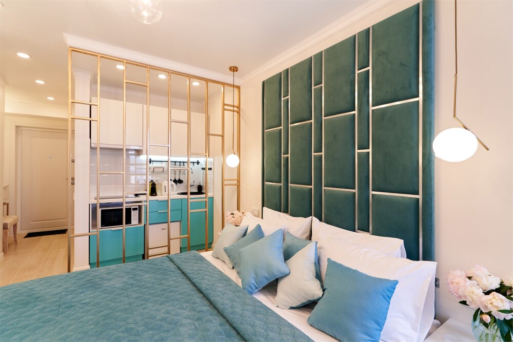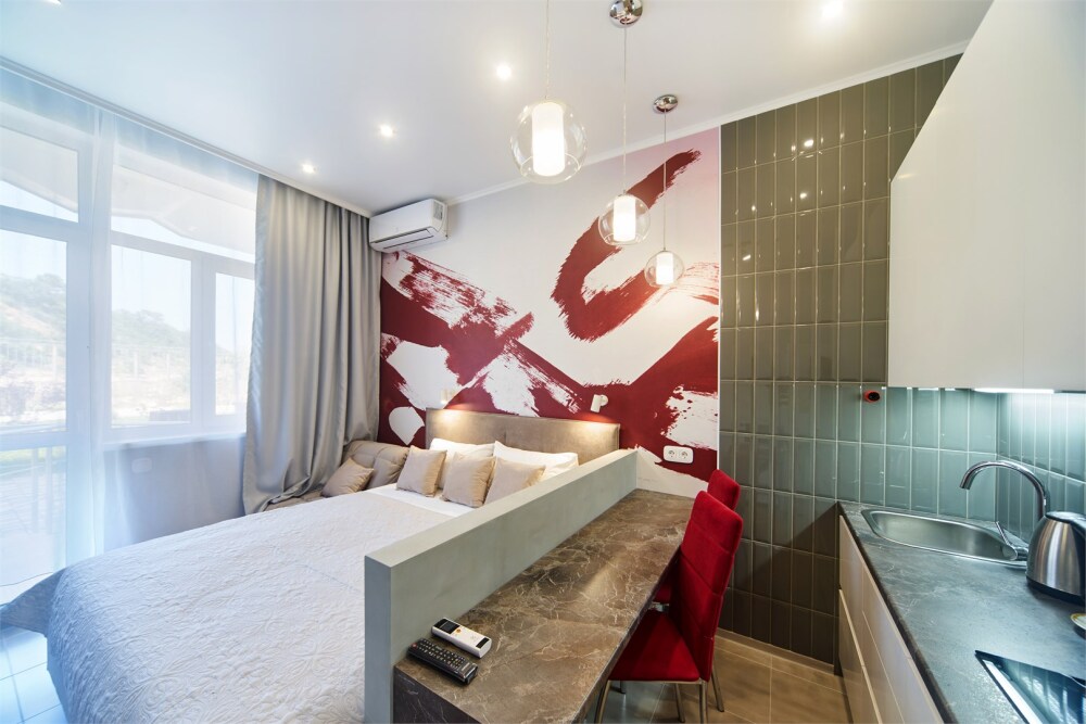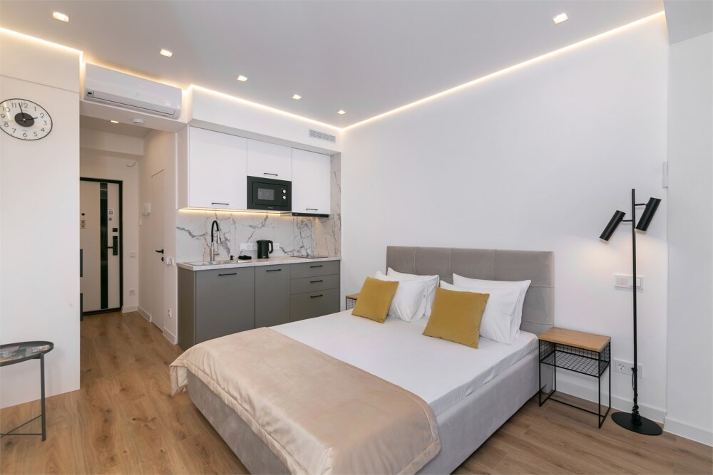 Вас ждёт уютная спальня с удобной двуспальной кроватью и раскладным диваном, что делает эти апартаменты идеальными для одного или двух взрослых, с возможностью организации дополнительного места.