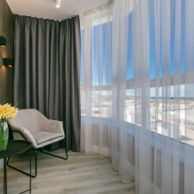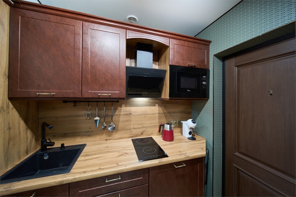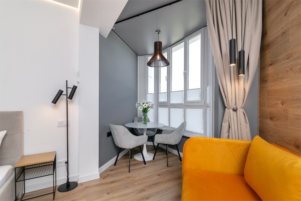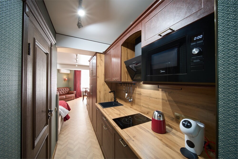 В номере есть всё необходимое для вашего комфортного пребывания: закрытый балкон, где Вы сможете расслабиться в любое время дня, обеденная зона, кофемашина для утреннего бодрящего кофе, а также полностью оборудованная кухонная зона с плитой и набором посуды.