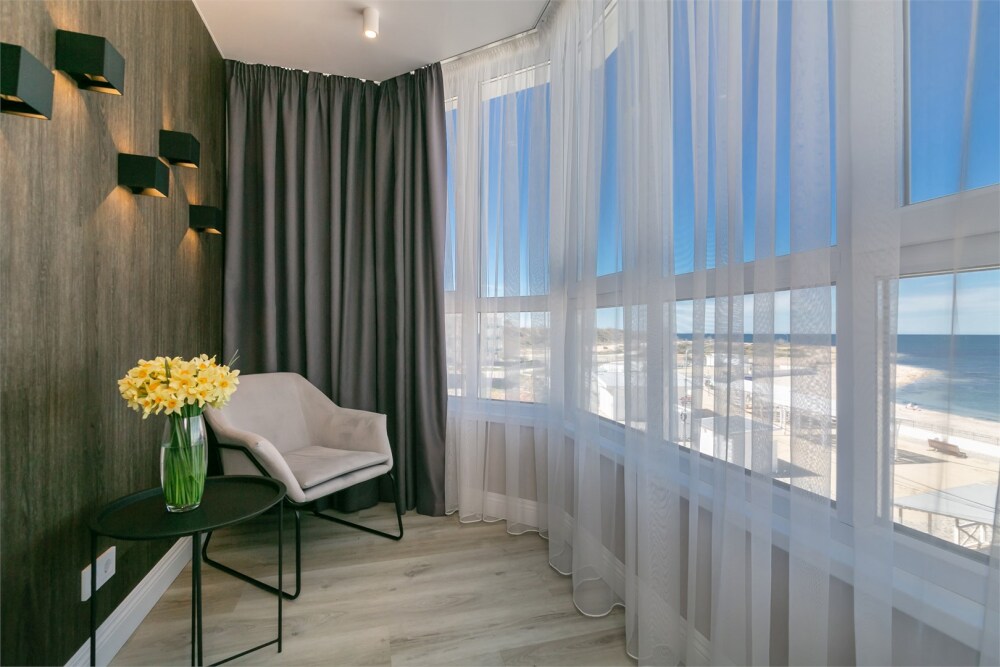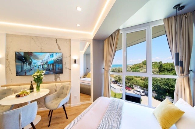 В номере предусмотрено всё для Вашего комфортного пребывания: уютная лоджия с видом на море, обеденная зона, а также кухонная зона с плитой и набором посуды. Для Вашего удобства в апартаментах также есть телевизор, бесплатный Wi-Fi и индивидуальный климат-контроль.