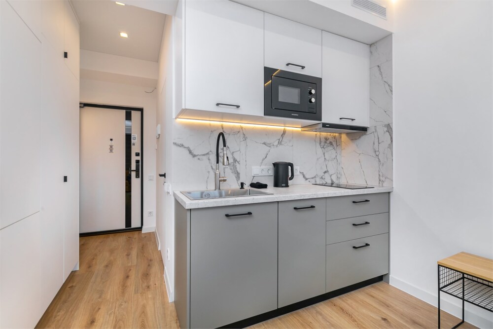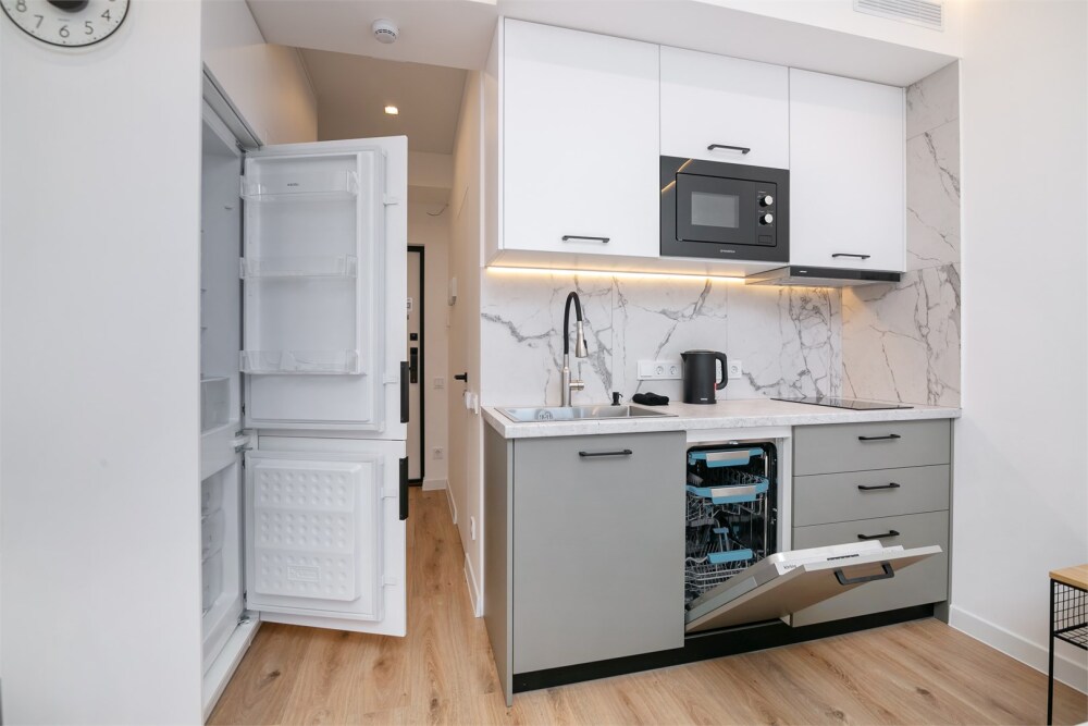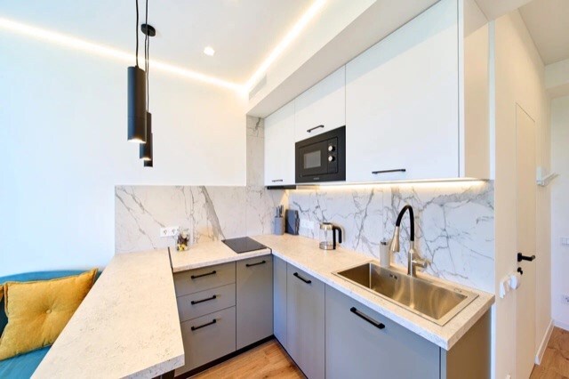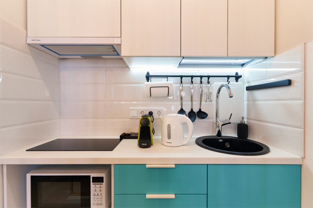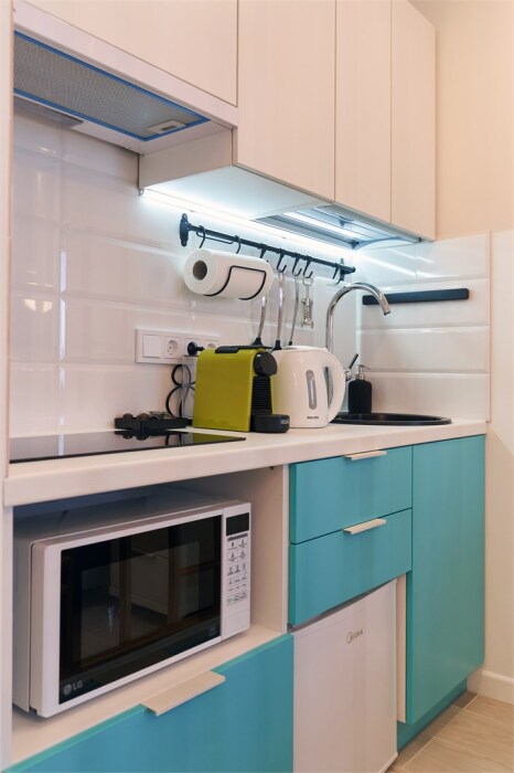Кухонная зона с варочной поверхностью, холодильником и микроволновой печью, стиральная машина, кондиционер для комфортной температуры в любое время года.