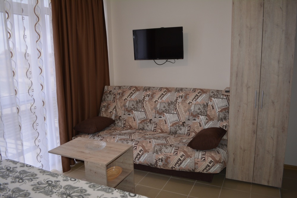 Песчаные пляжи переходят в галечные. На пляже можно бывать столько раз за день, сколько захотите, не тратя время на дорогу. С тыльной стороны апарт-отеля в 30 м расположено самое большое в Крыму озеро Сасык-Сиваш, которое облюбовали утки и лебеди.