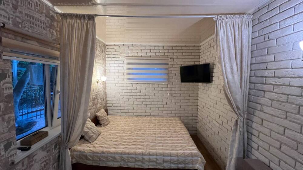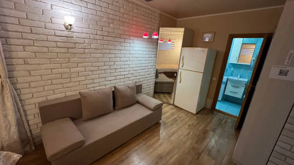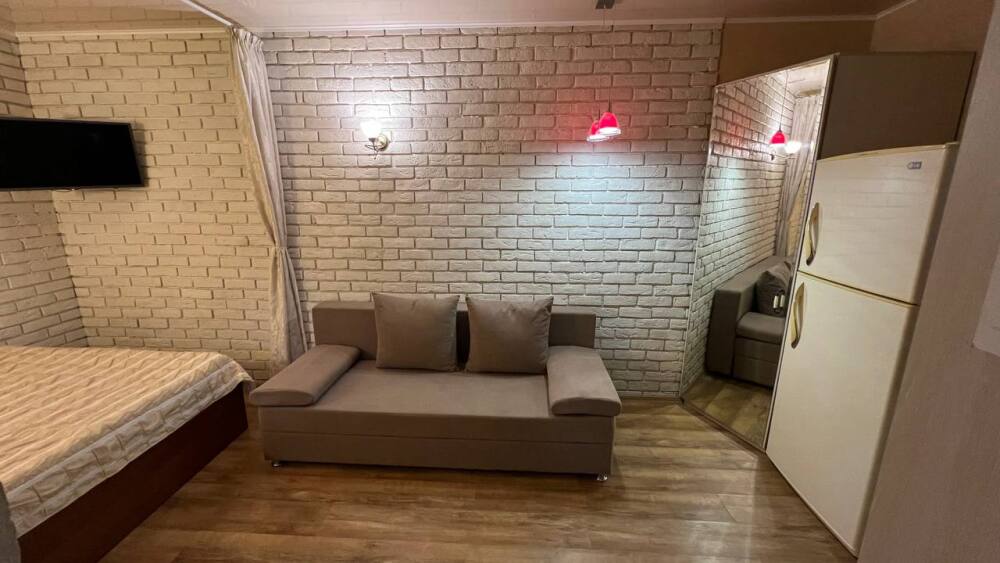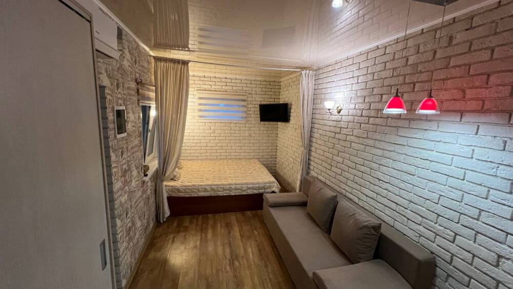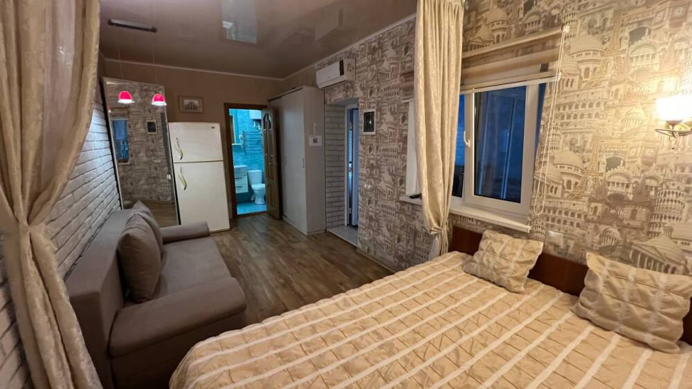 - комната с отделенной шторами спальной зоной, оборудованную кондиционером, итальянский диван, два шкафа, холодильник с морозилкой LG no frost;