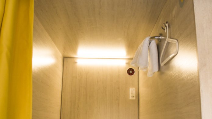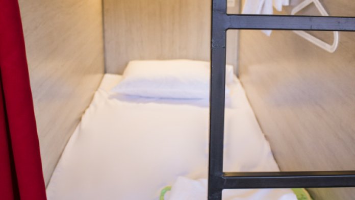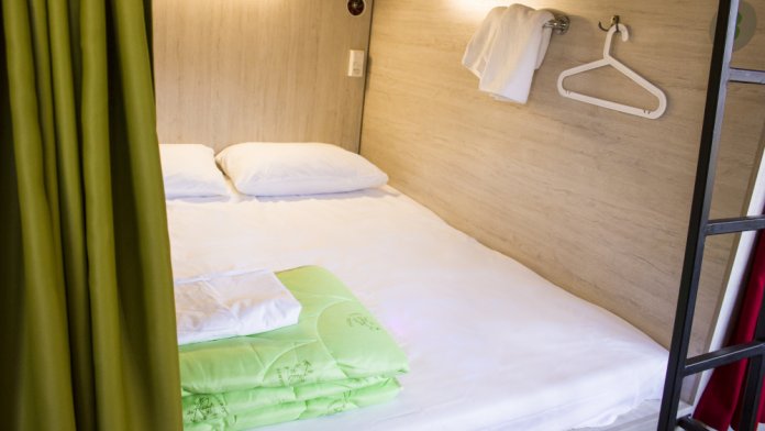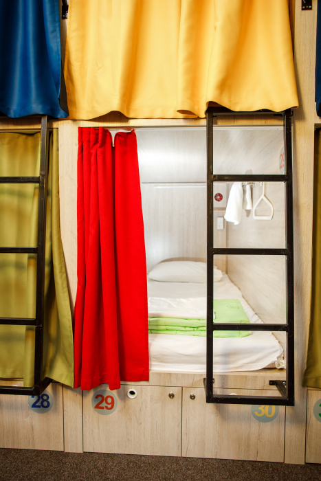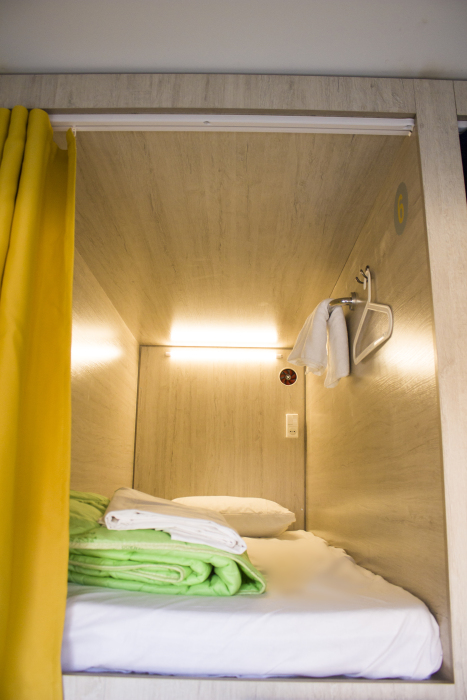 Уютные и светлые 4 капсулы для женщин и мужчин в комнате общей вместимостью 8 кроватей, с вентиляцией и локером.