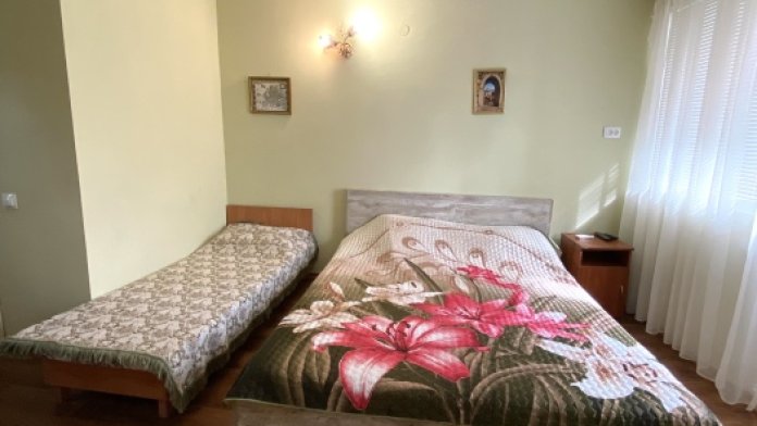 В 1 комнате: двуспальная кровать и односпальная кровать,столик, шкаф, плазм. телевизор, холодильник,чайник.