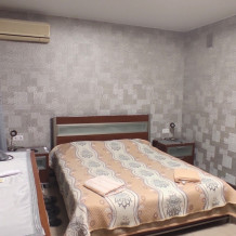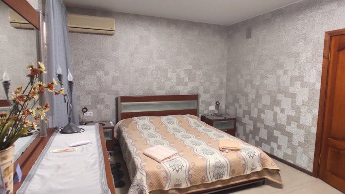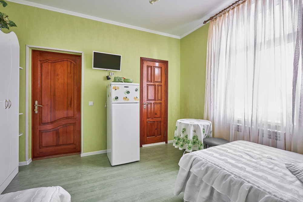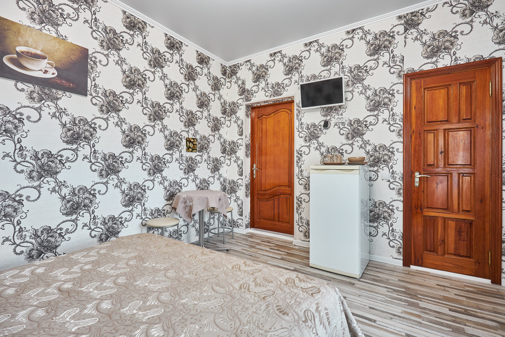 Комфортабельный однокомнатный номер с одной двуспальной кроватью и всеми удобствами. В номере кондиционер, телевизор, холодильник, стол, набор посуды и всё, что нужно для комфортного отдыха.