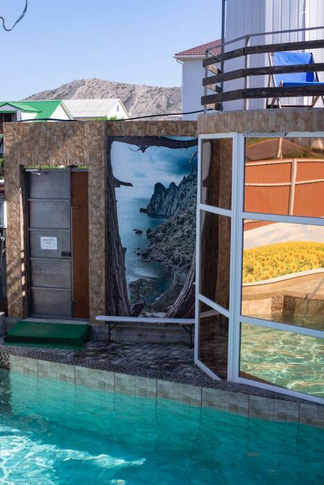 В спальне кондиционер, телевизор, небольшой шкафчик, утюг, на балконе стоит холодильник, микроволновая печь, чайник, тумбочка с кухонной посудой (чашки, тарелки, миски для салатов, миски для фруктов, приборы и доска). Стол и три стула. Номер расположен только на третьем этаже с балконом и красивым видом.