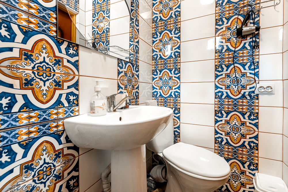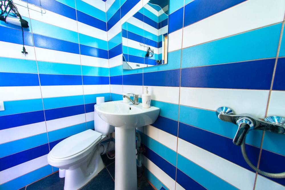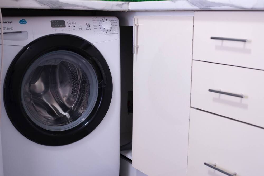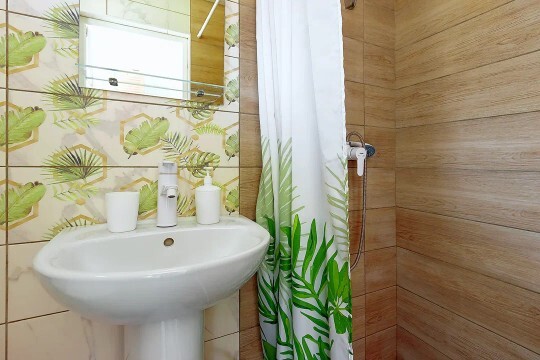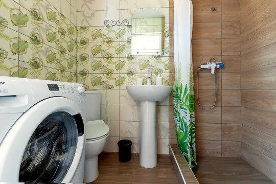 Удобства: душ, туалет, раковина, зеркало и стиральная машинка.