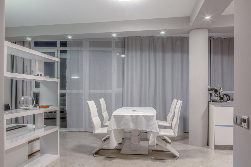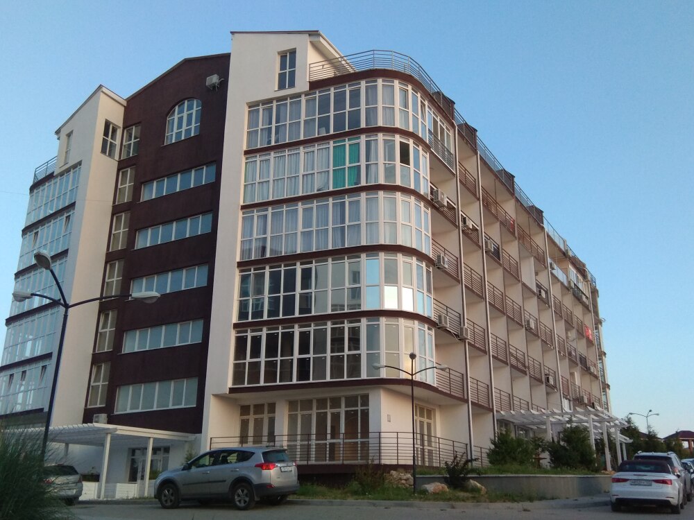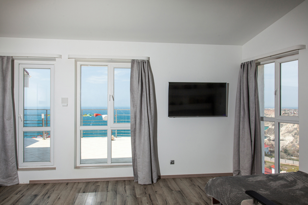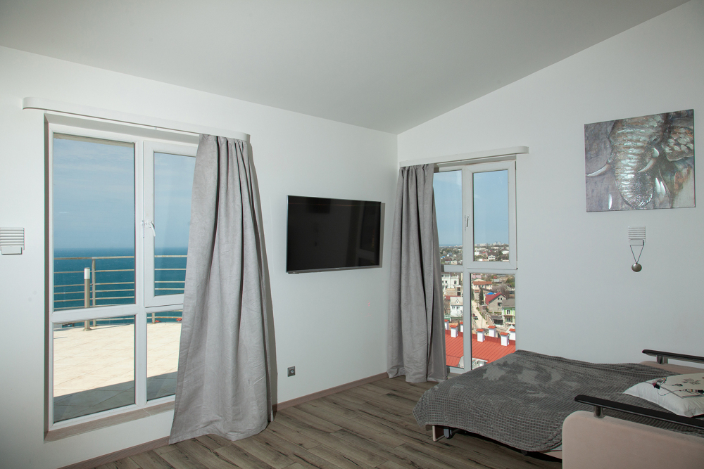 Студия двух этажная (5-6этаж, 6 этажного здания), на нижнем этаже имеется большая гостиная с большой кухней, барным столом, панорамными окнами от пола до потолка, и панорамным видом на море. В другом конце гостиной имеется угловой двух спальный диван .