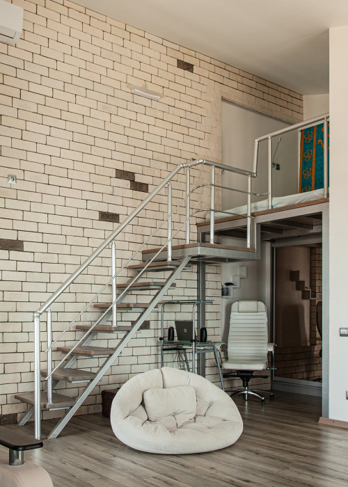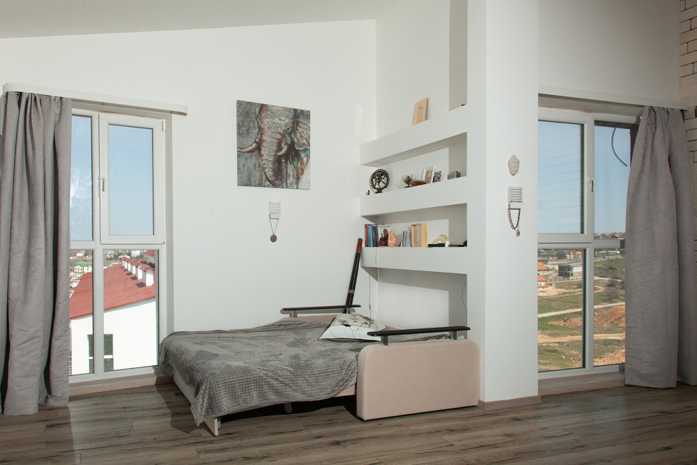 Сама же мансарда верхнего этажа пентхауса представляет просторную комнату студию 35 м. кв., с четырьмя окнами, она же является и спальней с высоким скошенным 4 метровым потолком и со своей отдельной ванной комнатой.