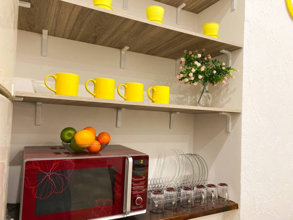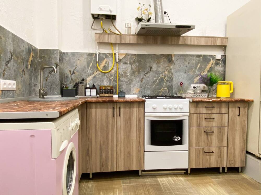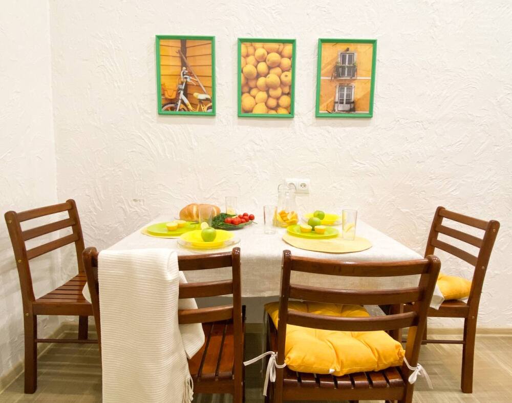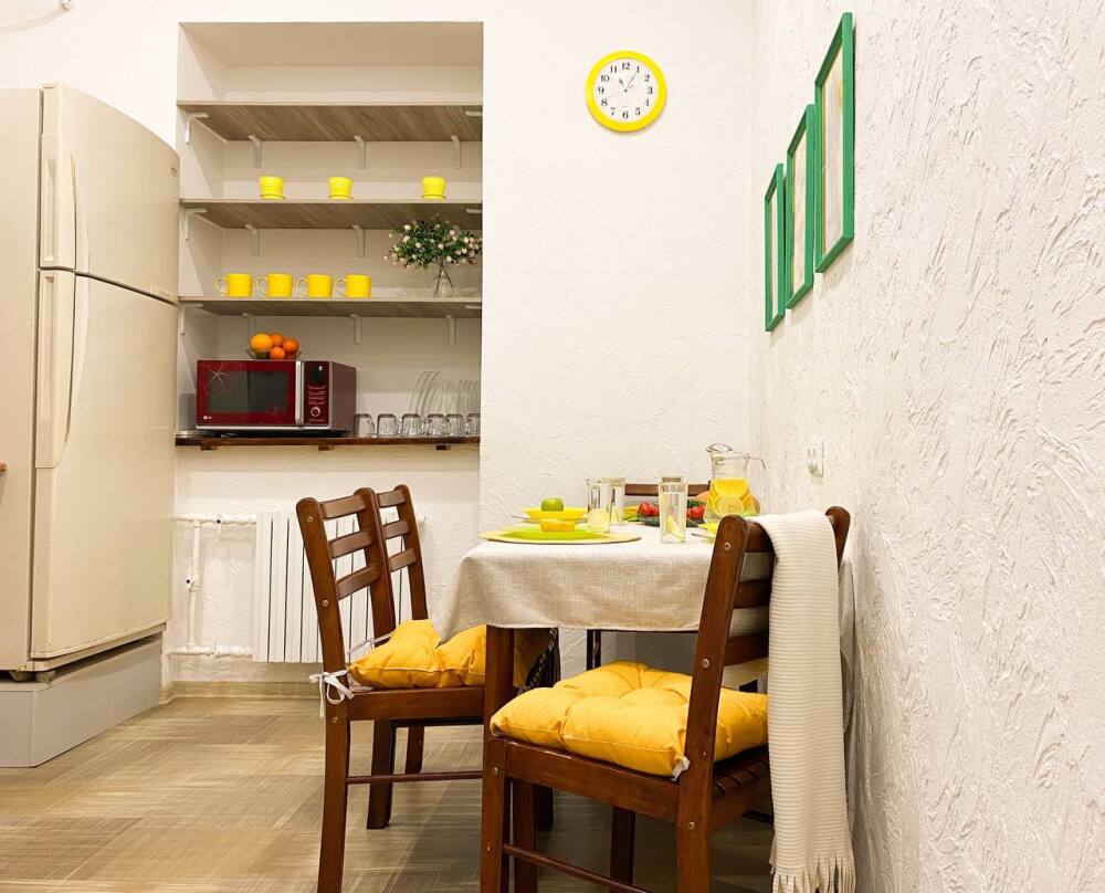 3. Квартира упакована всем необходимым для комфортного отдыха, есть стиральная машинка, в каждой комнате по телевизору, кондиционеры как в комнатах, так и на балконе. Кухня просторная, вмещает одновременно до 6 человек (4 стула и 2 табурета).