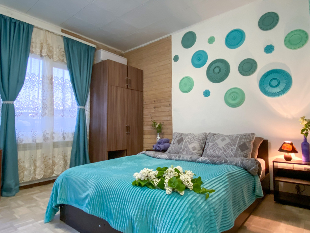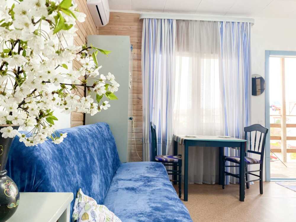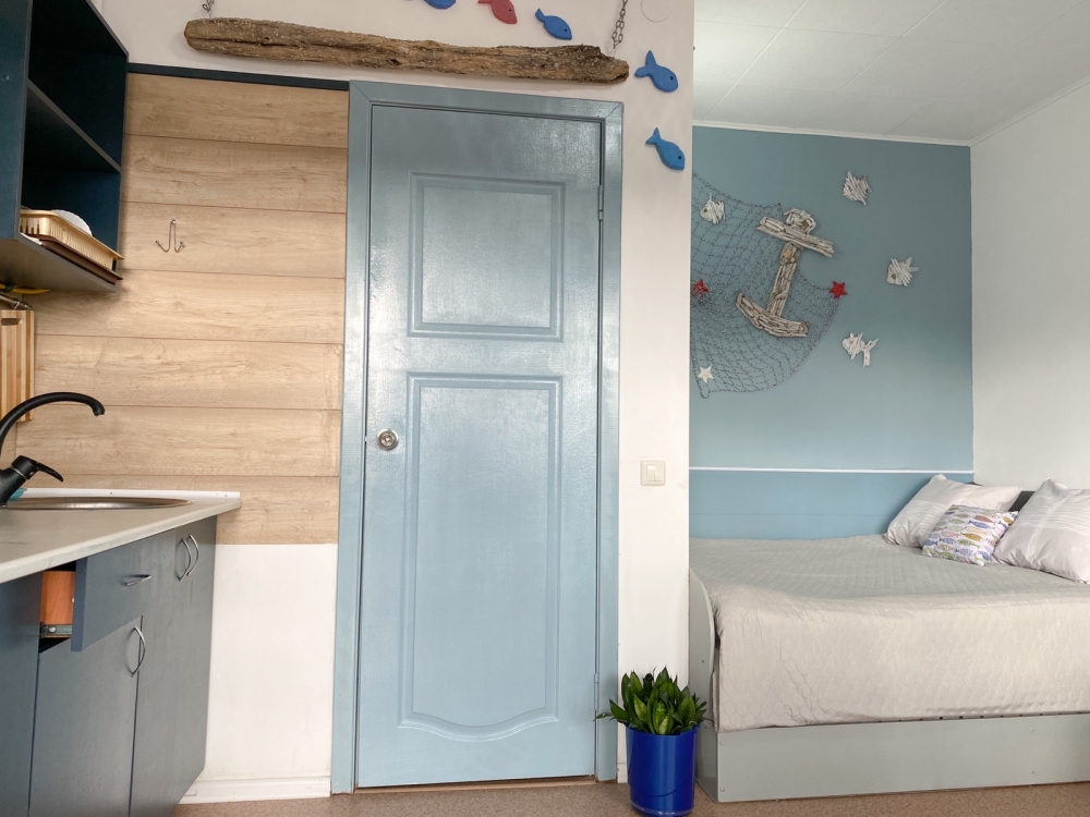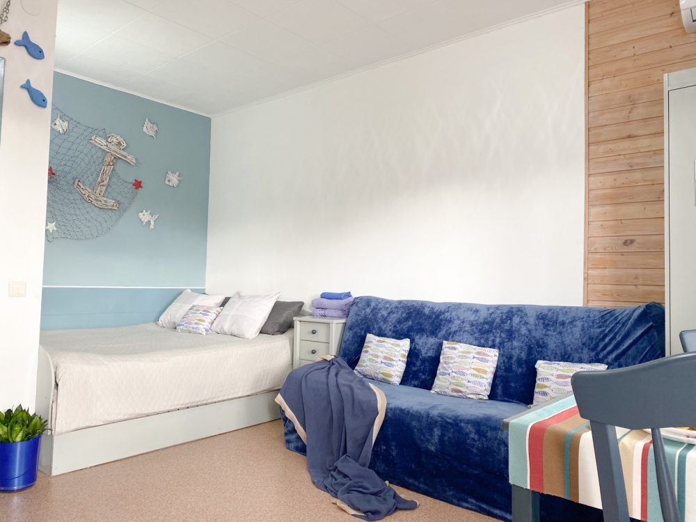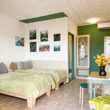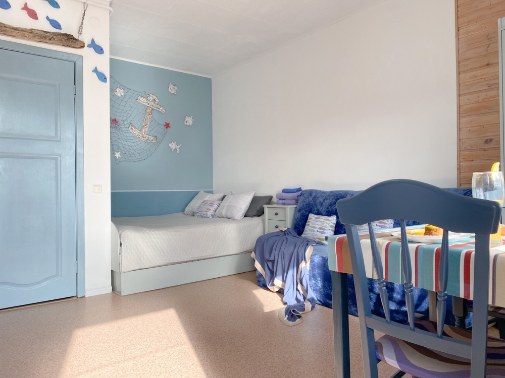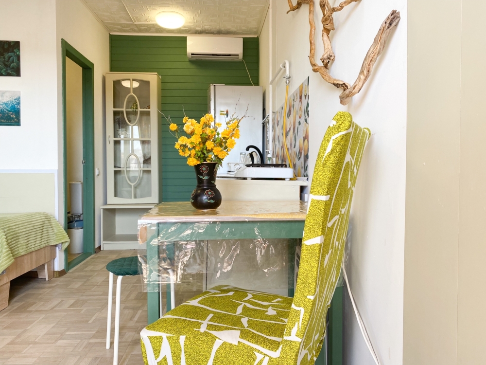В номере: двухспальная кровать размером 140*200, диван раскладной на 2 гостей, собственный санузел с душевой кабиной, собственная кухня, кондиционер, обеденный стол, шкаф, холодильник, посуда, чайник, газовая плитка, быстрый интернет.