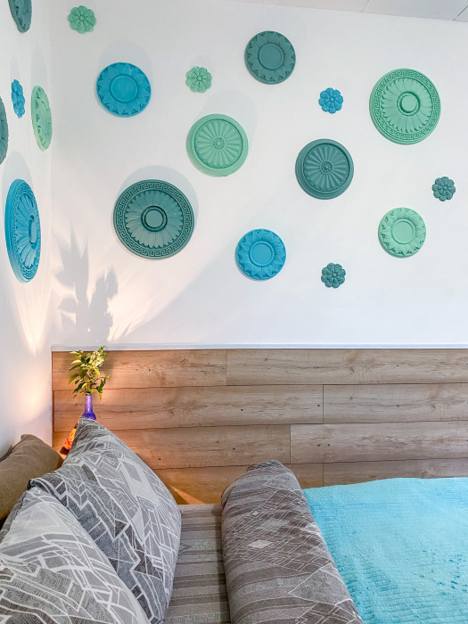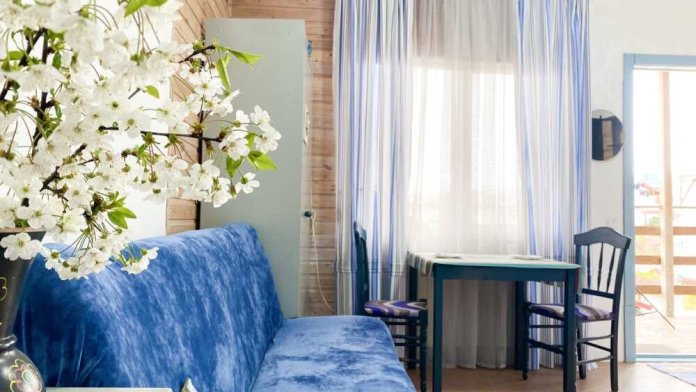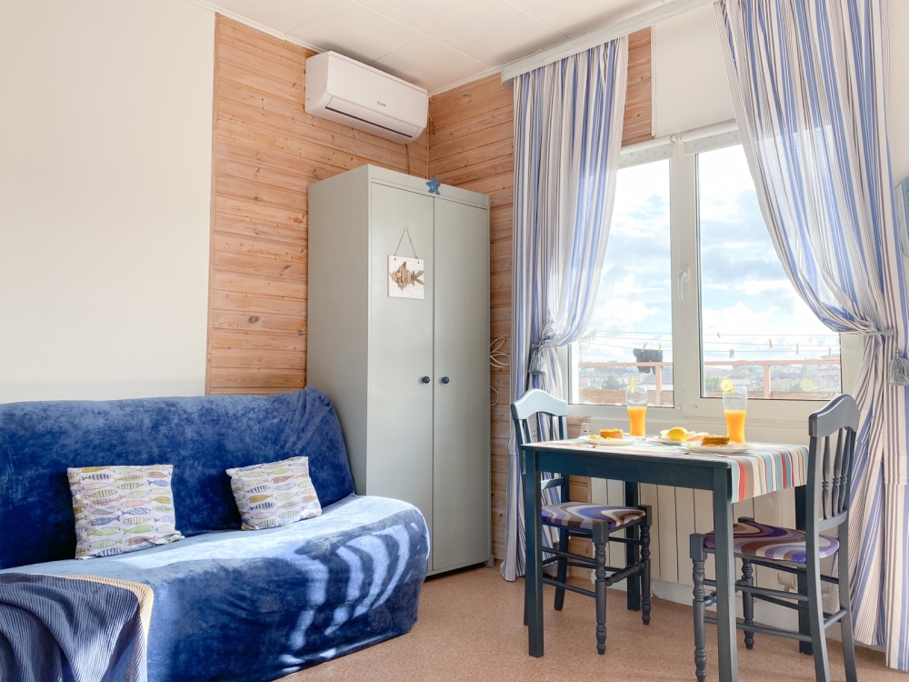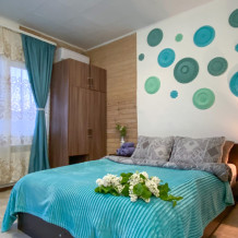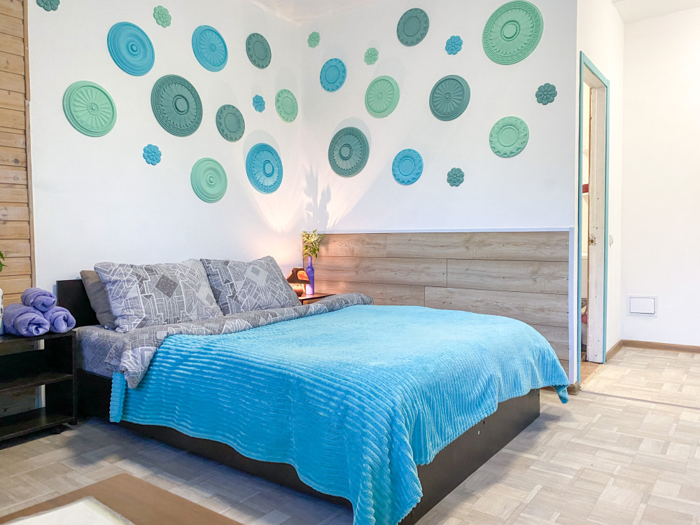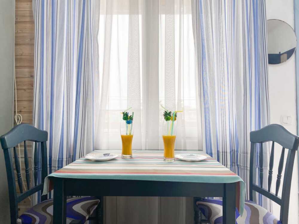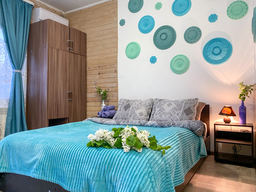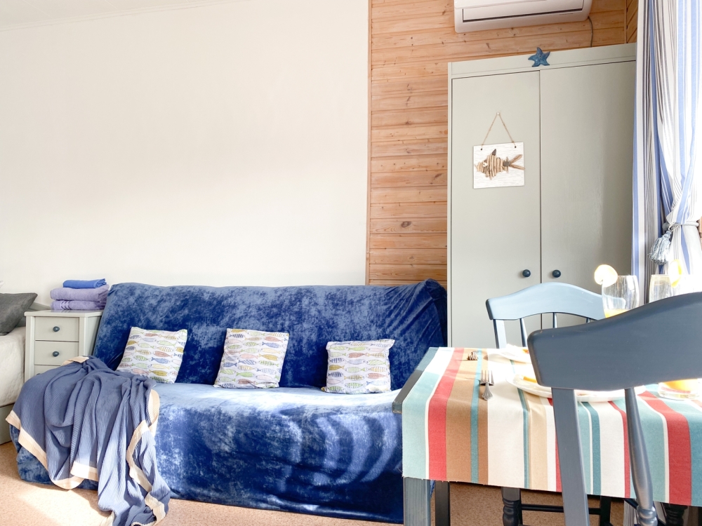 В номере: двухспальная кровать размером 140*200, диван раскладной на 2 гостей, собственный санузел с душевой кабиной, собственная кухня, кондиционер, обеденный стол, шкаф, холодильник, посуда, чайник, газовая плитка, быстрый интернет.