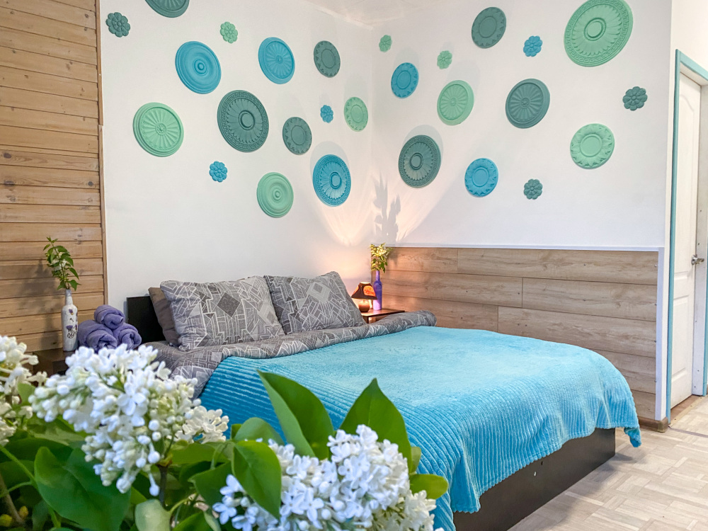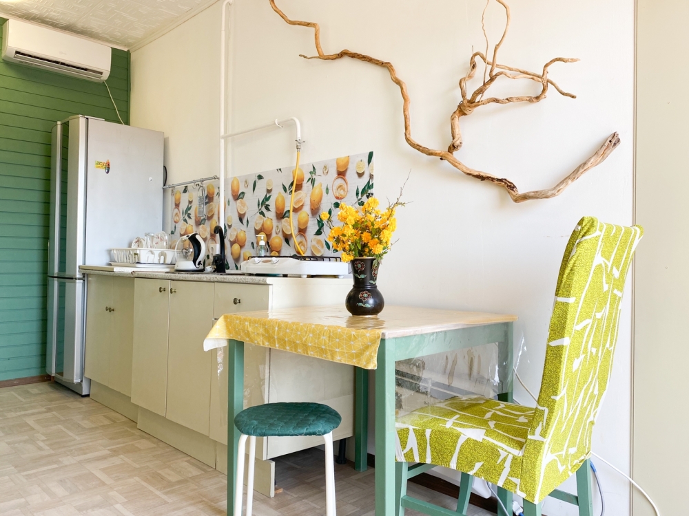 В номере: двухспальная кровать размером 160*200, диван, собственный санузел с душевой кабиной, собственная кухня, вентилятор, обеденный стол, шкаф, холодильник, посуда, чайник, газовая плитка, быстрый интернет.