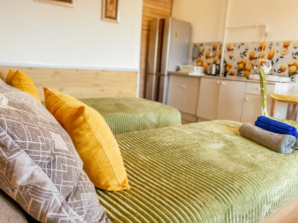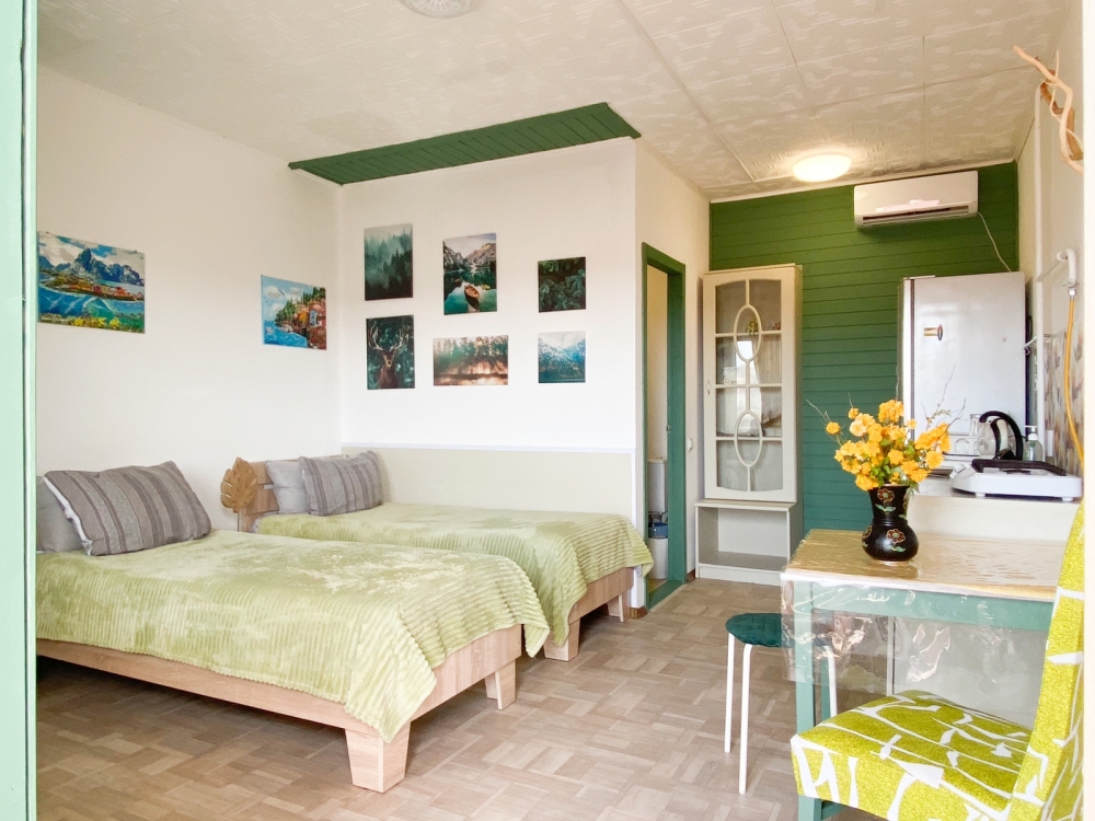 В номере: две односпальные кровати с возможностью их соединения, собственный санузел с душевой кабиной, собственная кухня, кондиционер, обеденный стол, шкаф, холодильник, посуда, чайник, газовая плитка, быстрый интернет.