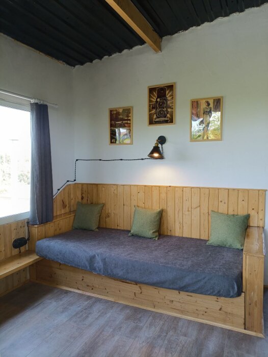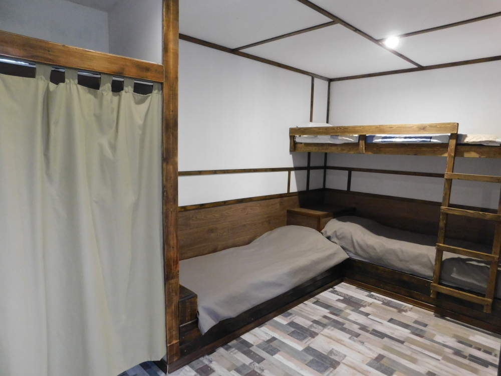 Номер с тремя односпальными кроватями из дерева, одна из которых во втором ярусе.