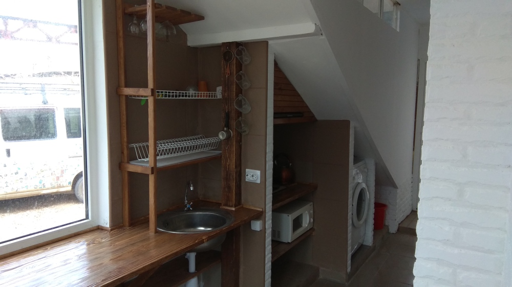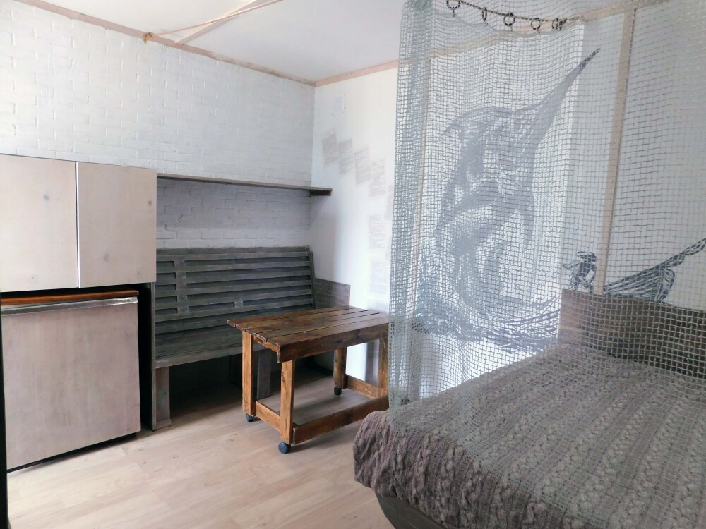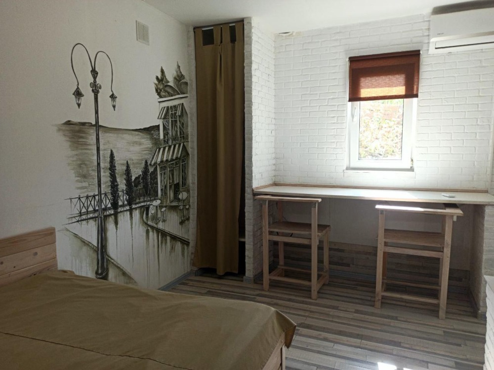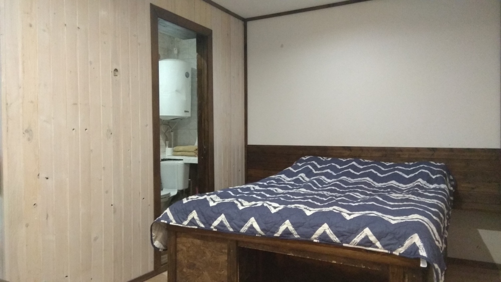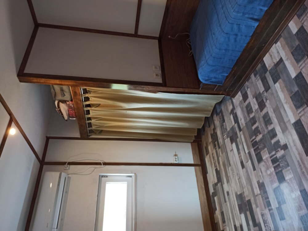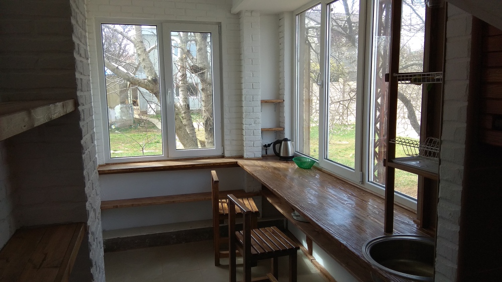 Комната-студия с двуспальной и односпальной кроватями, санузлом (туалет, душ), кухней и террасой, кондиционером. Зона кухни оборудована холодильником, мойкой, плитой, свч-печью, чайником, вытяжкой, столом для приготовления и приёма пищи; имеется вся необходимая посуда. Три раздвижных окна с видом на сад, улицу и террасу. С террасы открывается живописный вид на рядом растущее дерево (сливу) и на близлежащие сады; на террасе есть стол со стульями. Комната с высокими потолками, выполнена в ретро-стиле с натуральным деревом в интерьере. По договорённости возможно проживание с животными.