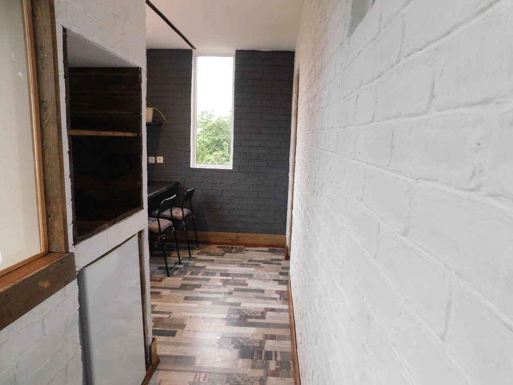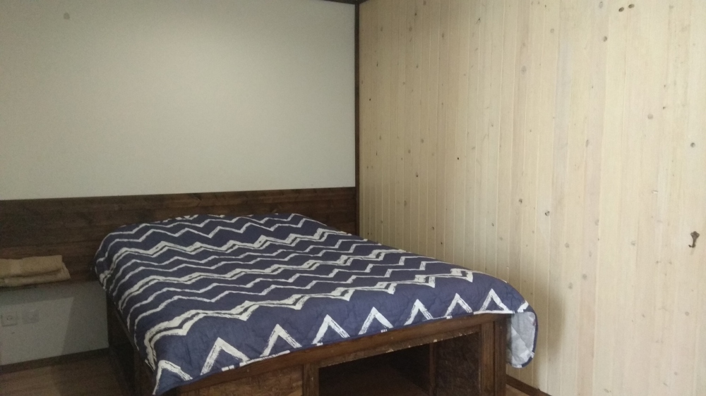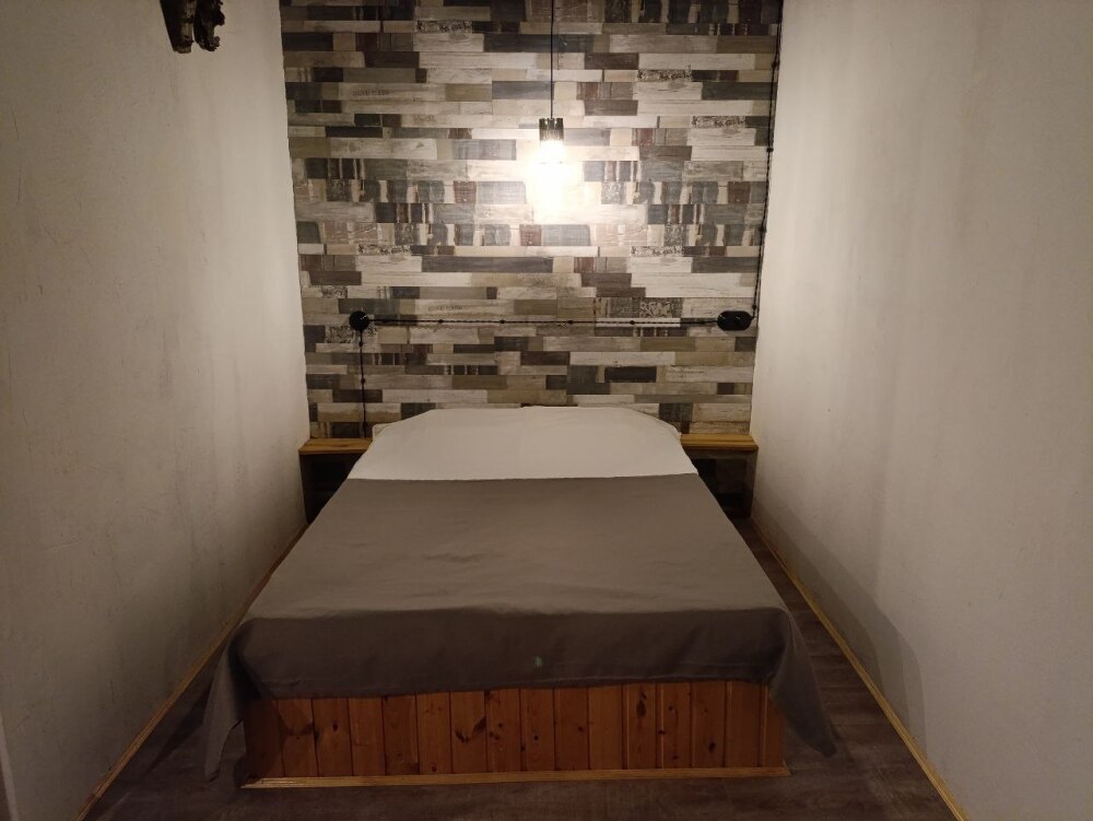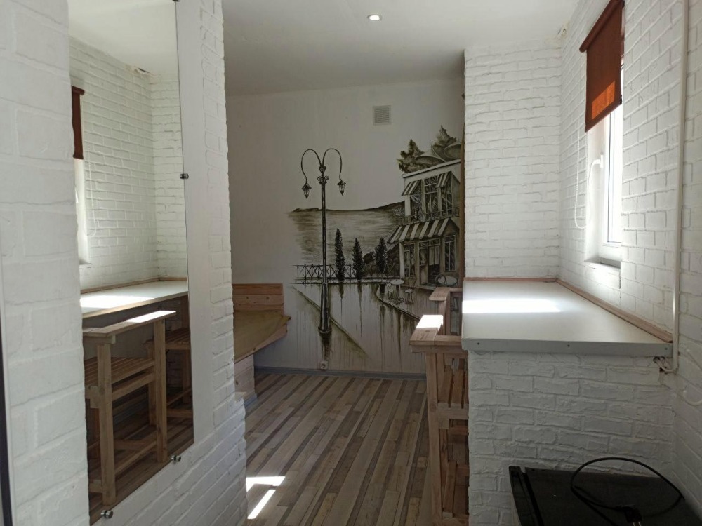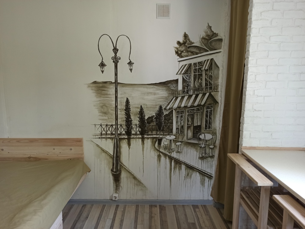 Комната-студия с двуспальной и односпальной кроватями, санузлом (туалет, душ), кухней и террасой, кондиционером. Зона кухни оборудована холодильником, мойкой, плитой, свч-печью, чайником, вытяжкой, столом для приготовления и приёма пищи; имеется вся необходимая посуда. Три раздвижных окна с видом на сад, улицу и террасу. С террасы открывается живописный вид на рядом растущее дерево (сливу) и на близлежащие сады; на террасе есть стол со стульями. Комната с высокими потолками, выполнена в ретро-стиле с натуральным деревом в интерьере. По договорённости возможно проживание с животными.