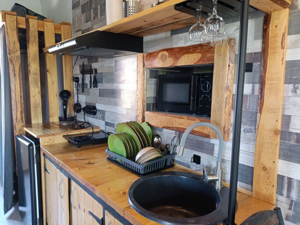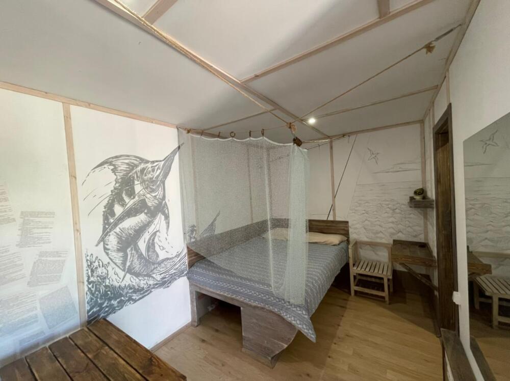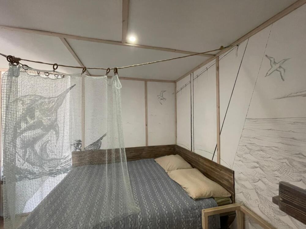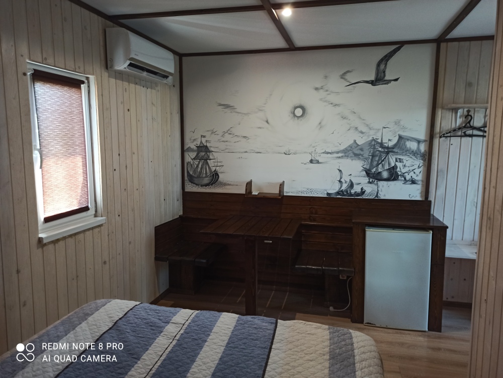 Двуспальная кровать, стилизованная под лодку; холодильник, WI-FI, зеркало, скамья, передвижной стол, компьютерный столик, деревянное кресло. Термодом, сохраняющий комфортную температуру; электрическое отопление (тёплый пол),кондиционер.