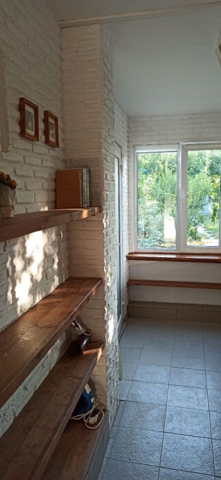 Отдельная проходная комната с холодильником, шкафом, столом и тремя стульями.