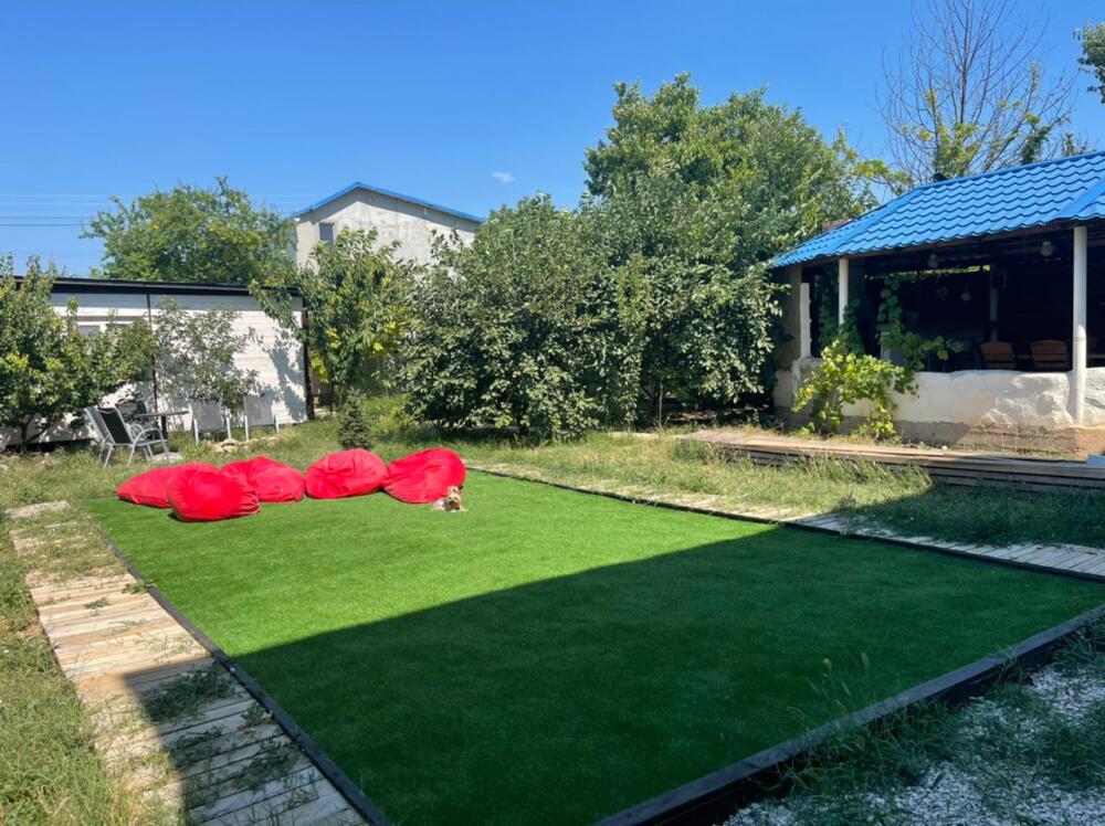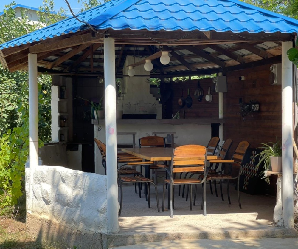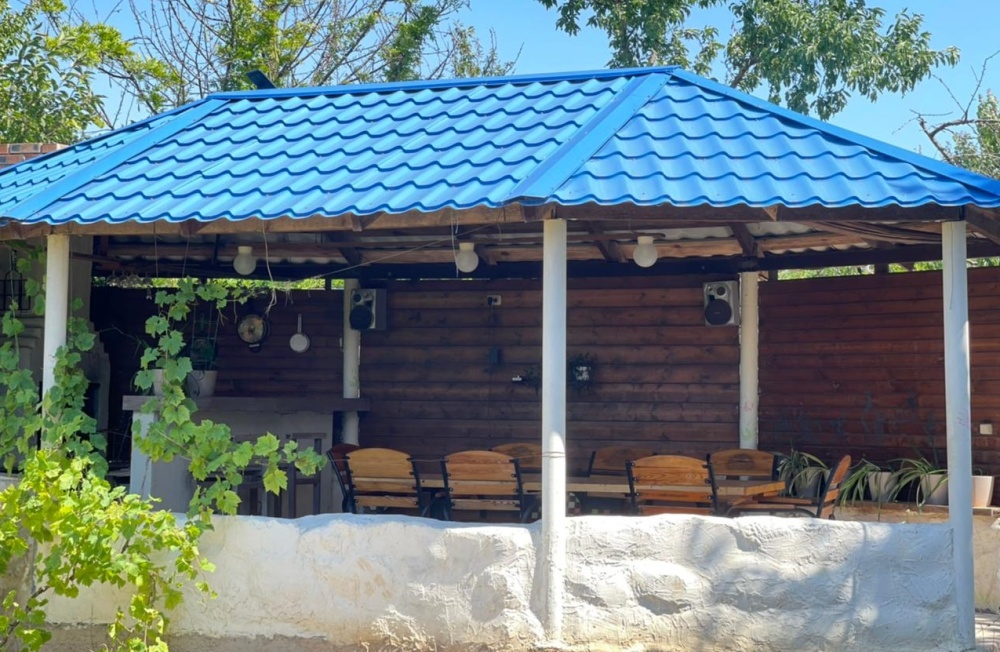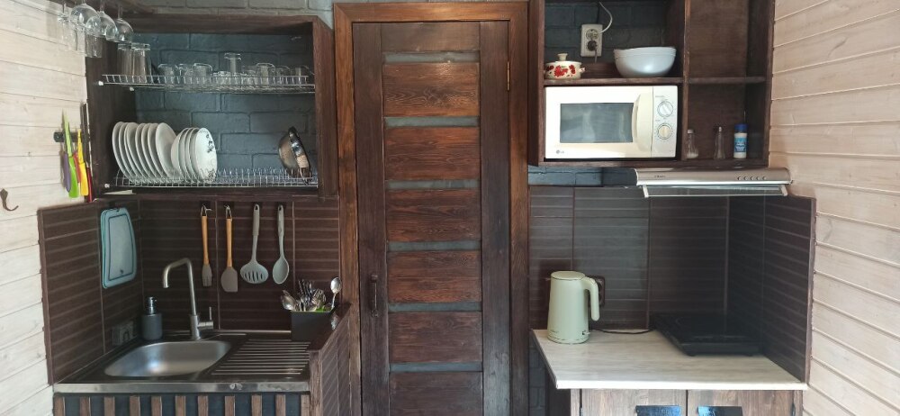 Отдельная кухня в гостевом доме на 4 комнаты. На территории: 1) большая беседка с летней кухней (мангал-барбекю, газовая плита, мойка, столы, посуда, барная стойка, музыкальный центр); 2) очаг-кострище с креслами и столом; 3) беседка с мангалом, столом и стульями; 4) площадка с искусственной травой и креслами-мешками; 5)просторный двор с плодовыми и хвойными деревьями.