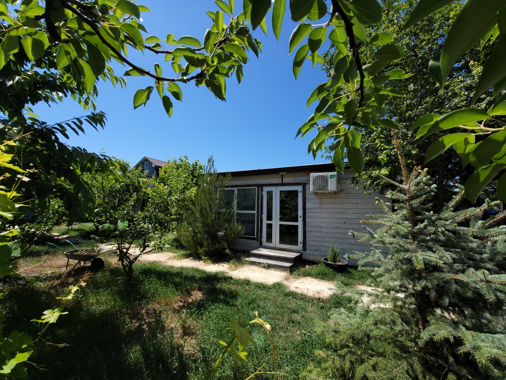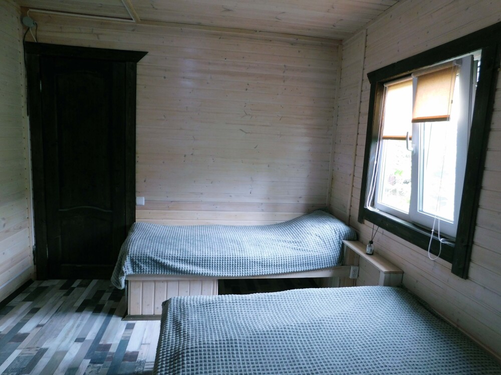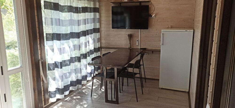 Отдельно стоящий гостевой дом (флигель) с двумя спальнями, общей комнатой с кухней и столовой. Кухня оборудована мойкой, плитой, свч-печью, имеется вся необходимая посуда. Дом деревянный, стены и потолок отделаны вагонкой. В каждой спальне большой шкаф. Гостиная с панорамным окном.