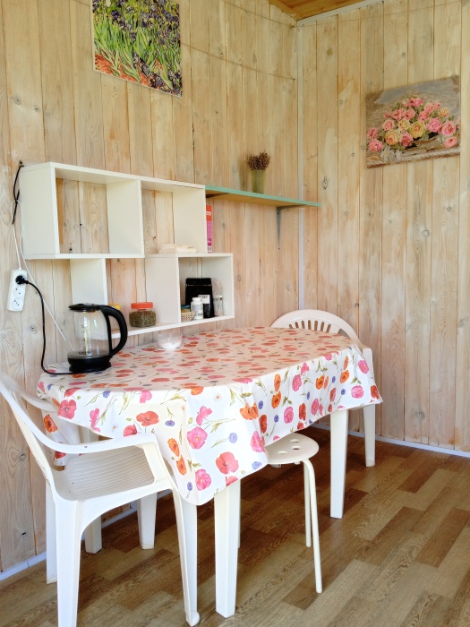 Наше пространство оборудовано всем необходимым для простой жизни на природе. В деревянных домиках пахнет сосной и крепко спится. Новые матрасы и постельное белье, удобные места для багажа и личных вещей. Есть кухня и стиральная машина. Санузлы и души с горячей водой круглосуточно, они расположены отдельно на территории.