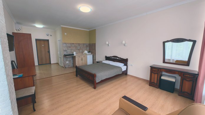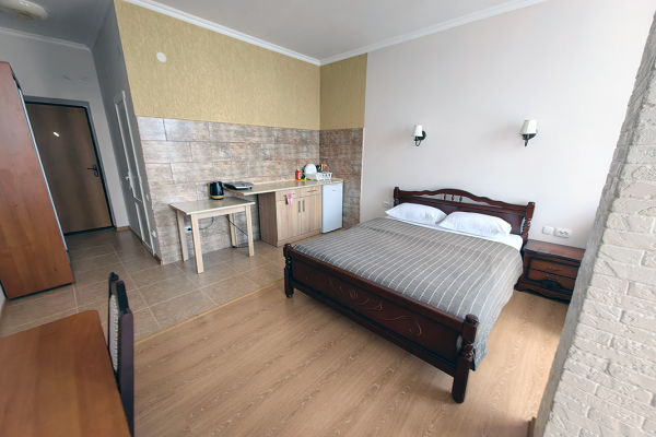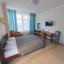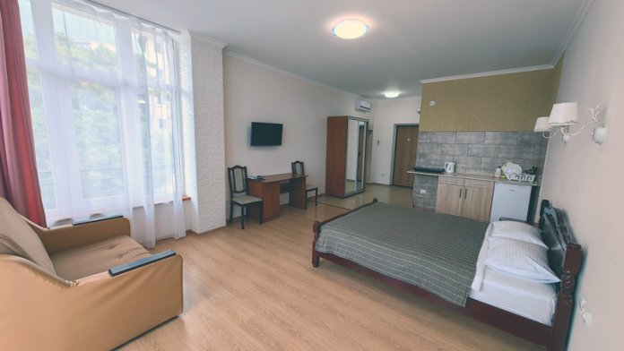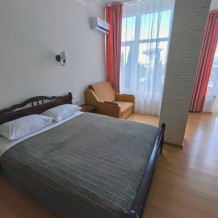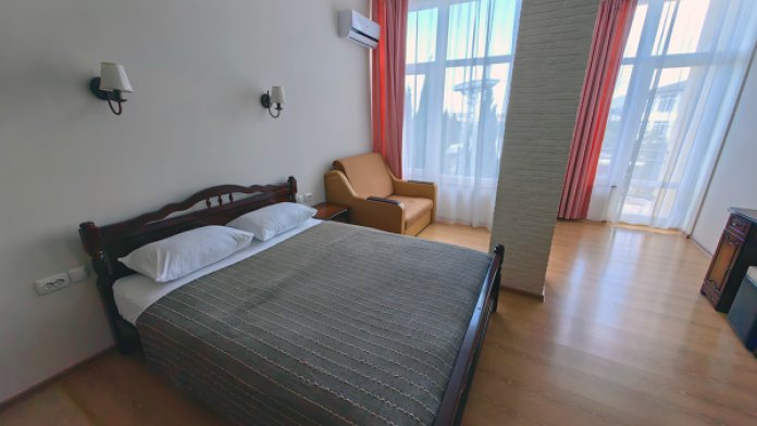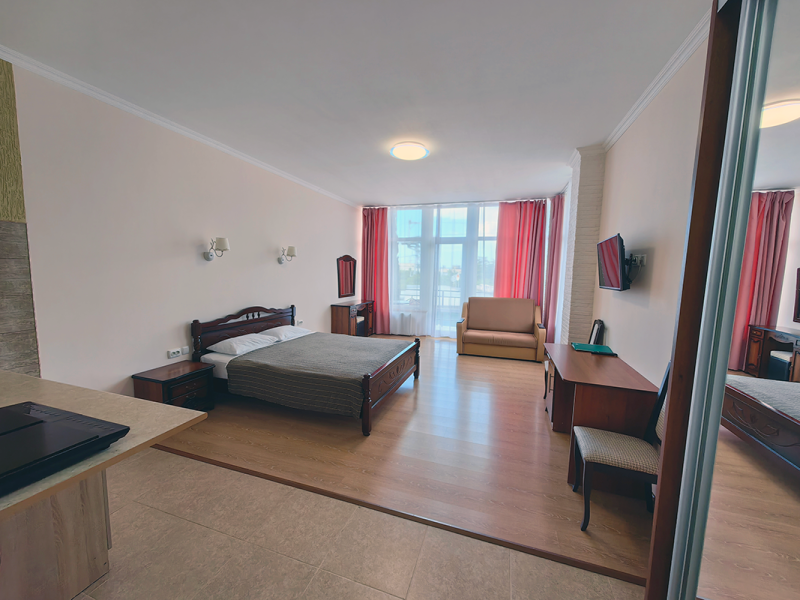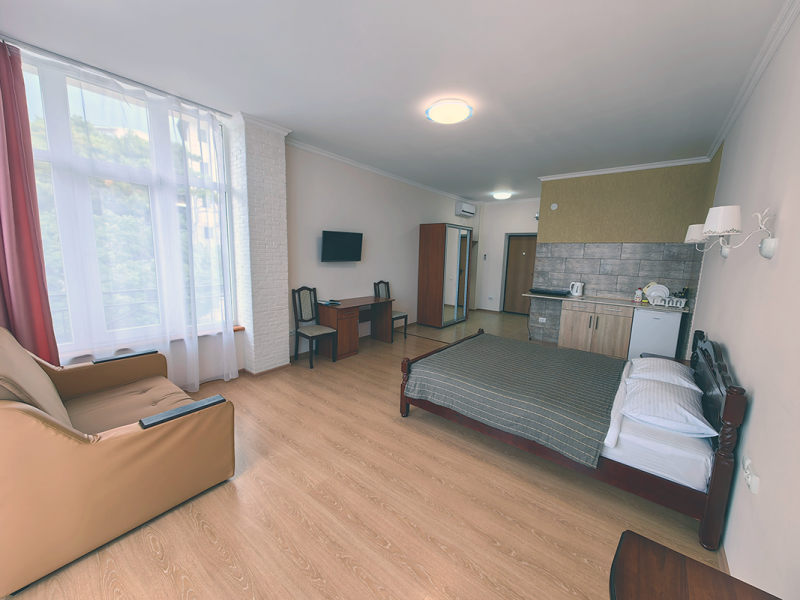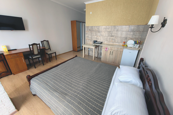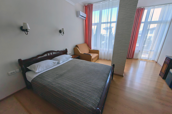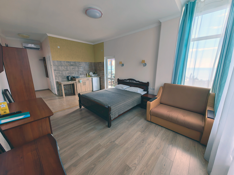 Уютные и просторные апартаменты с видом на море и балконом, где можно бесконечно наслаждаться видом на море. В номере двухспальная кровать и дополнительное спальное место - раскладное кресло-кровать. Мини-кухня оборудована чайником, холодильником, индукционной плитой и полным набором посуды. Номер укомплектован кондиционером, телевизором с плоским экраном, феном, полотенцами и белым сатиновым бельем.
