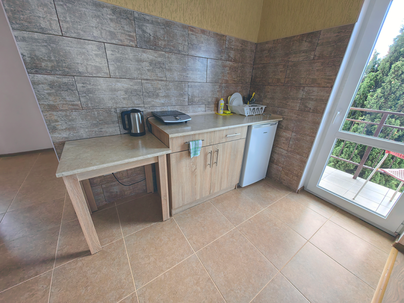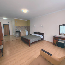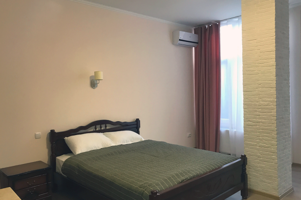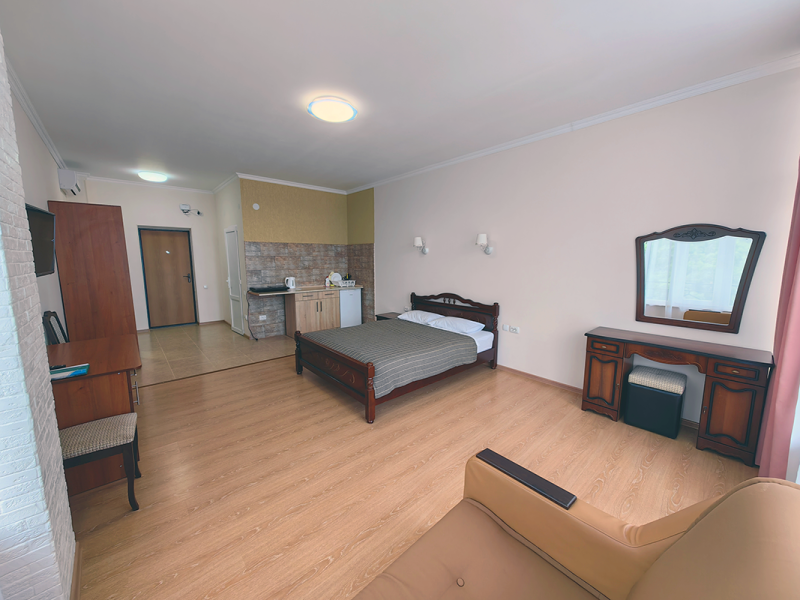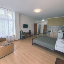 Уютные апартаменты с видом на парк и с балконом. В номере двухспальная кровать и дополнительное спальное место - раскладное кресло-кровать. Мини-кухня оборудована чайником, холодильником, индукционной плитой и полным набором посуды. В номере собственная ванная комната с душем. В номере есть кондиционер, фен, ванные принадлежности, тапочки.